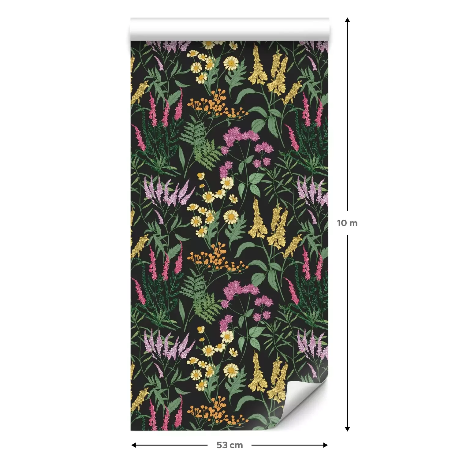 Eine Standard-Tapetenrolle hat die Maße 0,53 m x 10 m und deckt eine Wandfläche von etwa 5 m² ab.