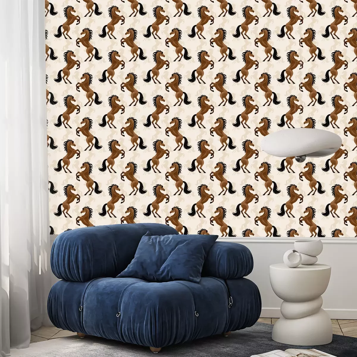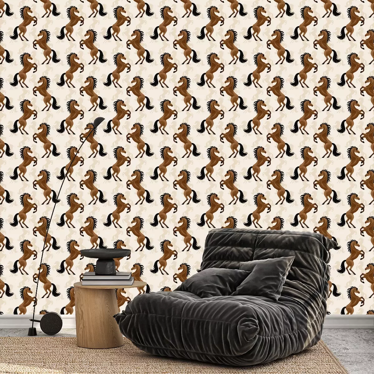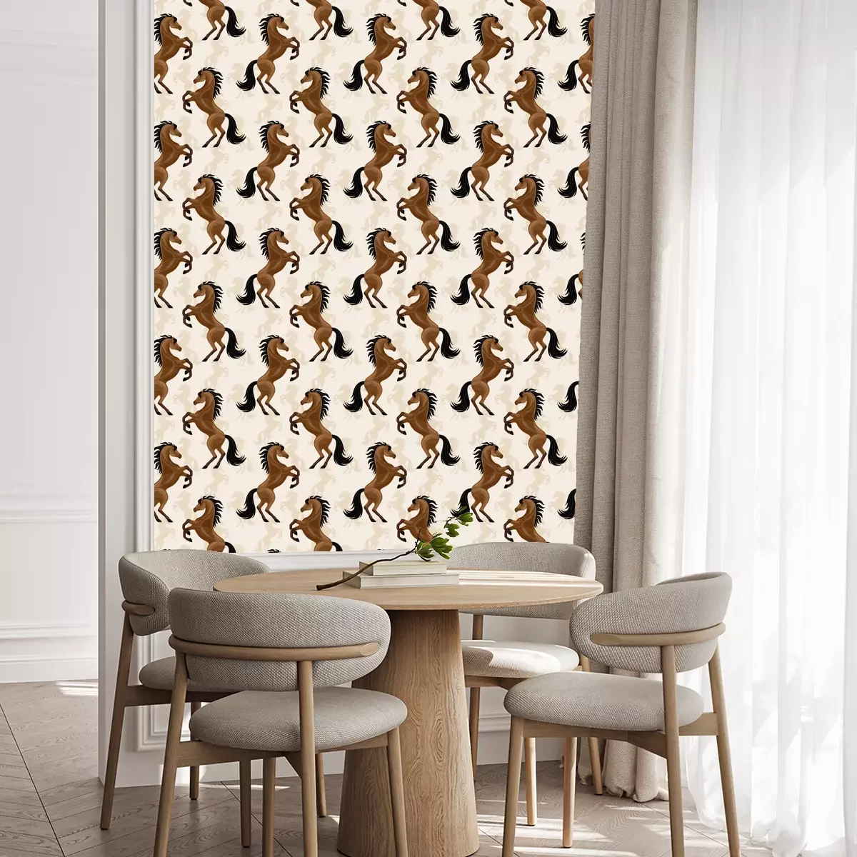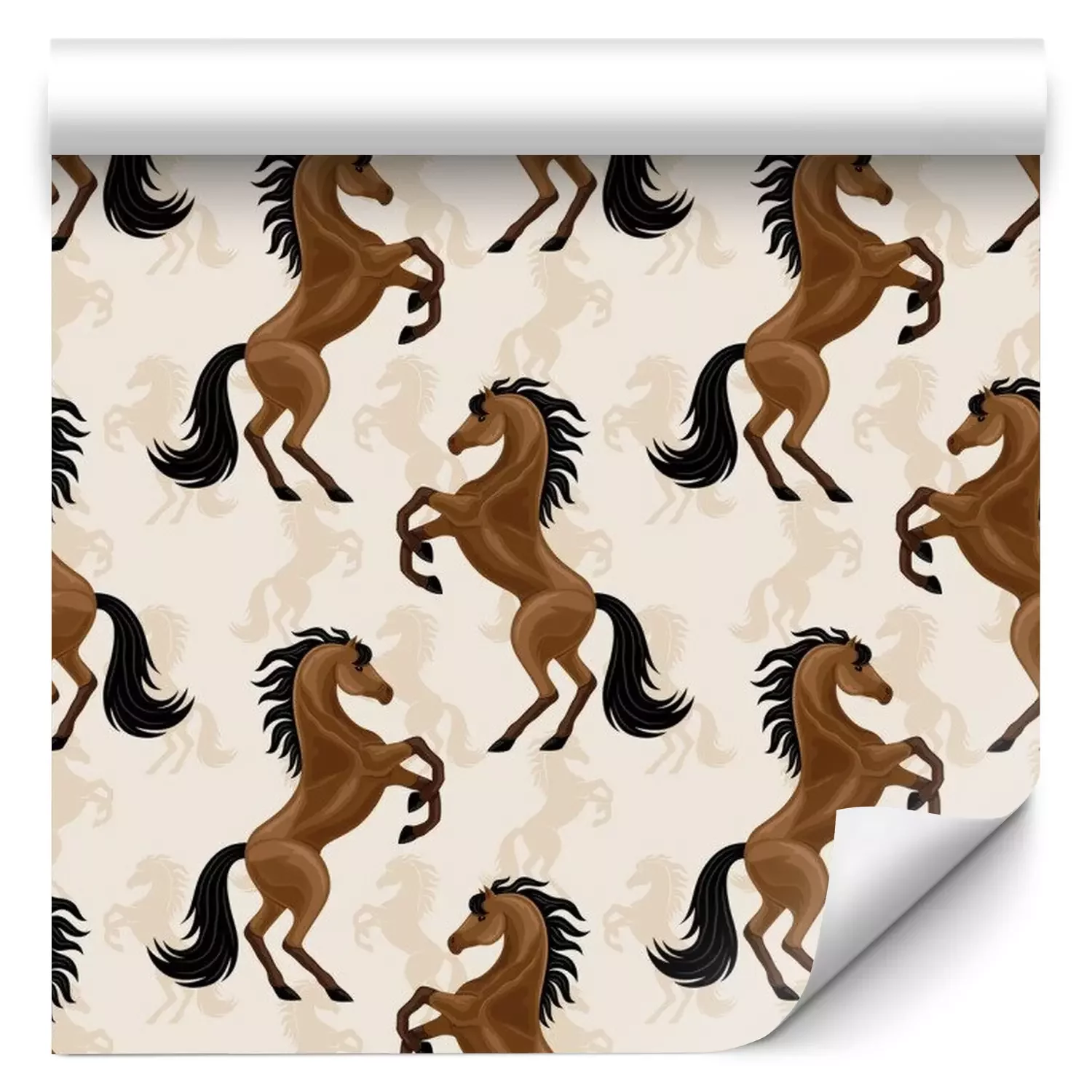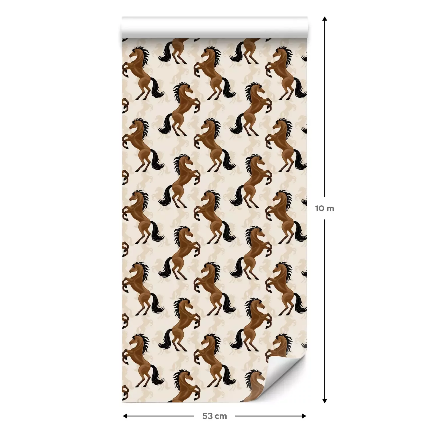 Eine Tapete Pferde auf beigefarbenem Hintergrund ist ein wundervolles Dekorationselement, das in verschiedenen Innenräumen erscheinen kann. Ihr einzigartiges Design zieht alle Blicke auf sich und verleiht dem Raum Charme. Sie zeigt majestätisch und stolz stehende Silhouetten von Pferden in ihrer ganzen Pracht. Diese Tapete mit Pferdemuster eignet sich perfekt für das Zimmer eines kleinen Tierliebhabers, besonders wenn das Kind Pferde mag. Eine Pferde Tapete kann an einer der Wände angebracht werden. Sie bildet so einen Blickfang. Das Kind wird von einem Raum voller Pferde begeistert sein, der seine Fantasie und seine Leidenschaft für reiterliche Abenteuer anregen kann. Wir haben einen cleveren Tipp für die Betonung des Hauptmotivs Pferde: Tapete kann mit Holzregalen für Bücher und Spielzeug dekoriert werden. Weiche Kissen in Erdfarben betonen das Bett eines kleinen Reiters. Zudem können Bilder mit Feldern und Wiesen oder Fotos mit Lieblingspferden dem Raum eine persönliche Note verleihen. Eine Tapete Pferde eignet sich auch hervorragend für einen Reitclub. Sie können sie in einer Lobby oder einem Loungebereich anbringen, um eine pferdebezogene Atmosphäre zu schaffen. Dies wird ein angenehmer Ort sein, um nach dem Training oder den Clubtreffen zu entspannen. Unterstreichen Sie diese Einrichtung mit großen Pferdebildern an den Wänden, Holzmöbeln wie Tischen und Stühlen, die einen rustikalen Charme vermitteln, und Dekorationen rund um den Pferdesport wie Tischlampen in Form von Zaumzeug und Sattel. Pflanzen in Töpfen, insbesondere solche mit natürlichem Waldflair, können einen Hauch von Frische in eine Clubeinrichtung bringen. Eine Tapete mit Pferdemotiv ist ein einzigartiges dekoratives Element, das verschiedenen Räumen Charme und Charakter verleihen kann. Mit den richtig ausgewählten Accessoires wie Möbeln, Bildern, Kissen und Dekorationen lässt sich sowohl im Kinderzimmer als auch in einem Reitclub eine stimmige und inspirierende Einrichtung schaffen. Eine Tapete Pferdemotiv erinnert uns an die Leidenschaft für diese wundervollen Tiere und schafft eine einzigartige Atmosphäre, in der sich Pferdeliebhaber wie ein Fisch im Wasser fühlen.