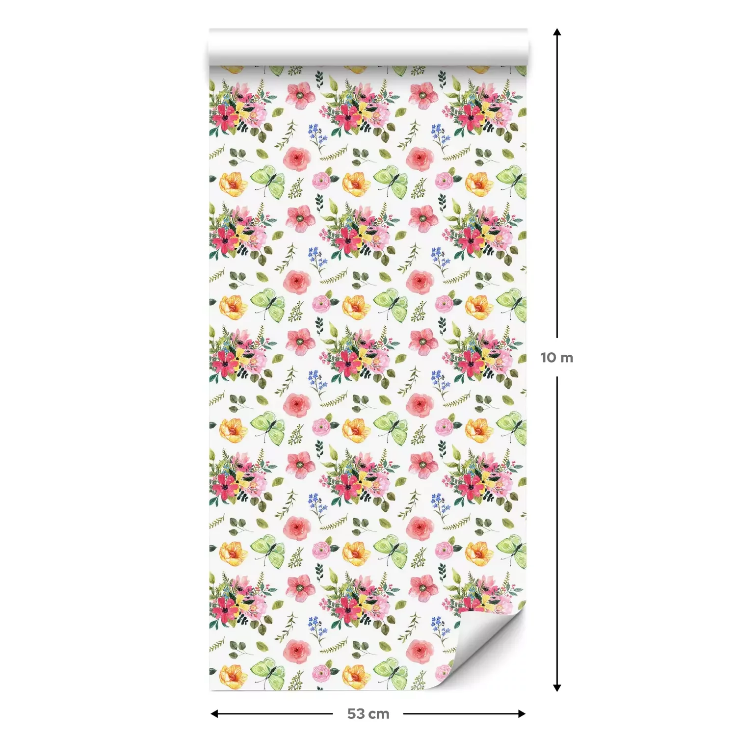 Eine Standard-Tapetenrolle hat die Maße 0,53 m x 10 m und deckt eine Wandfläche von etwa 5 m² ab.