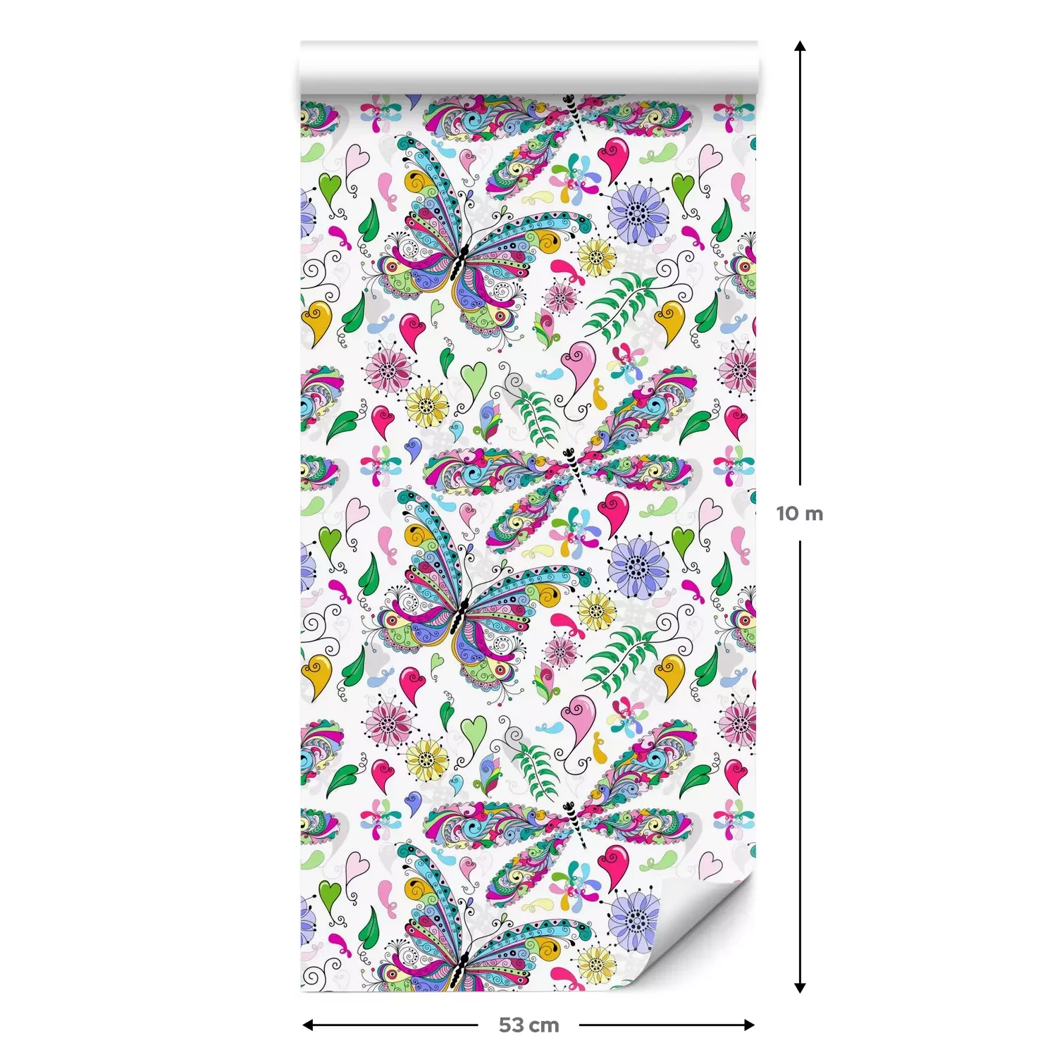Eine Standard-Tapetenrolle hat die Maße 0,53 m x 10 m und deckt eine Wandfläche von etwa 5 m² ab.