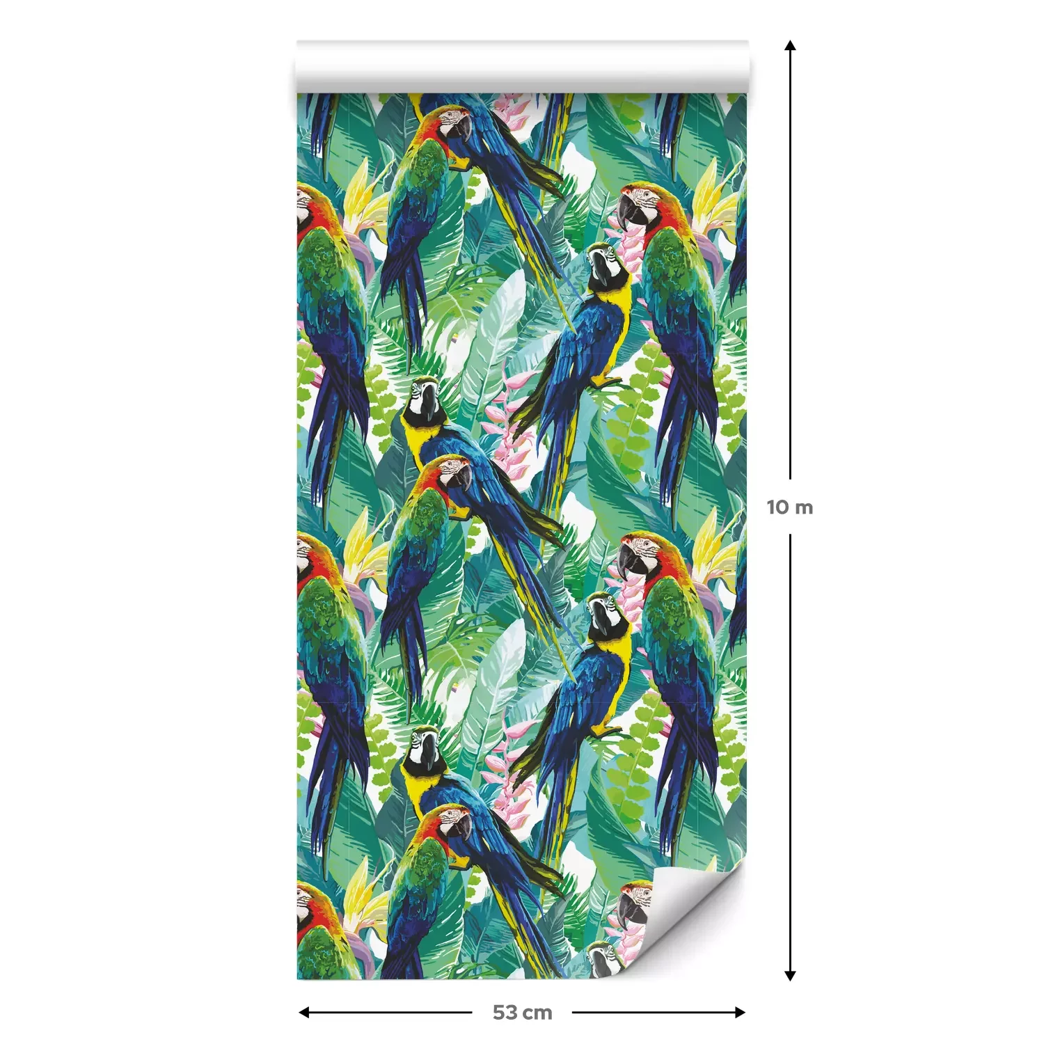 Eine Standard-Tapetenrolle hat die Maße 0,53 m x 10 m und deckt eine Wandfläche von etwa 5 m² ab.