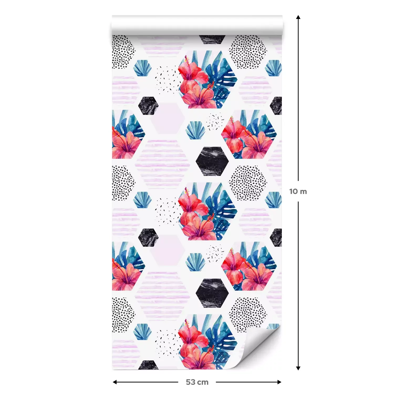 Eine Standard-Tapetenrolle hat die Maße 0,53 m x 10 m und deckt eine Wandfläche von etwa 5 m² ab.