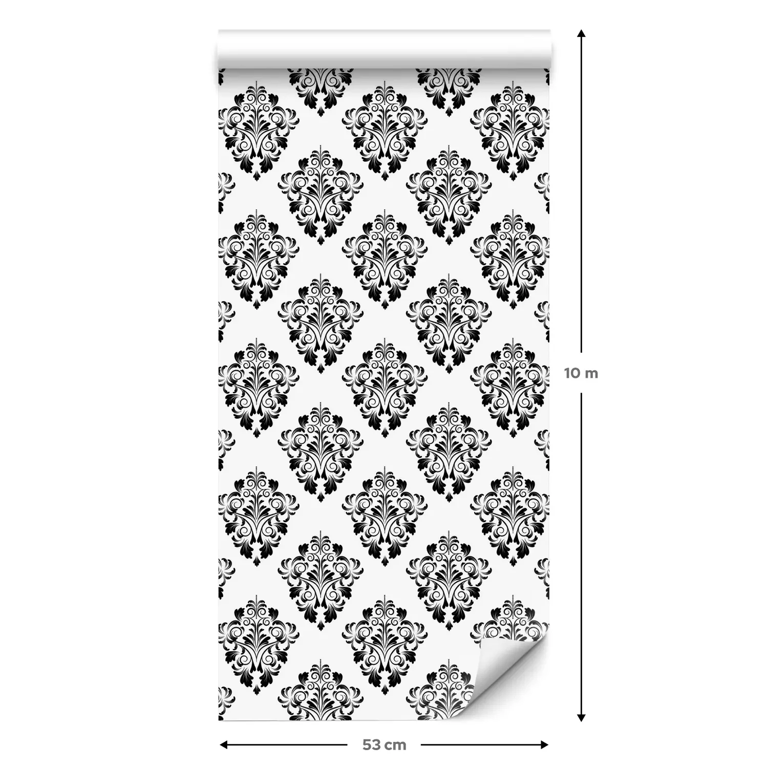 Eine Standard-Tapetenrolle hat die Maße 0,53 m x 10 m und deckt eine Wandfläche von etwa 5 m² ab.