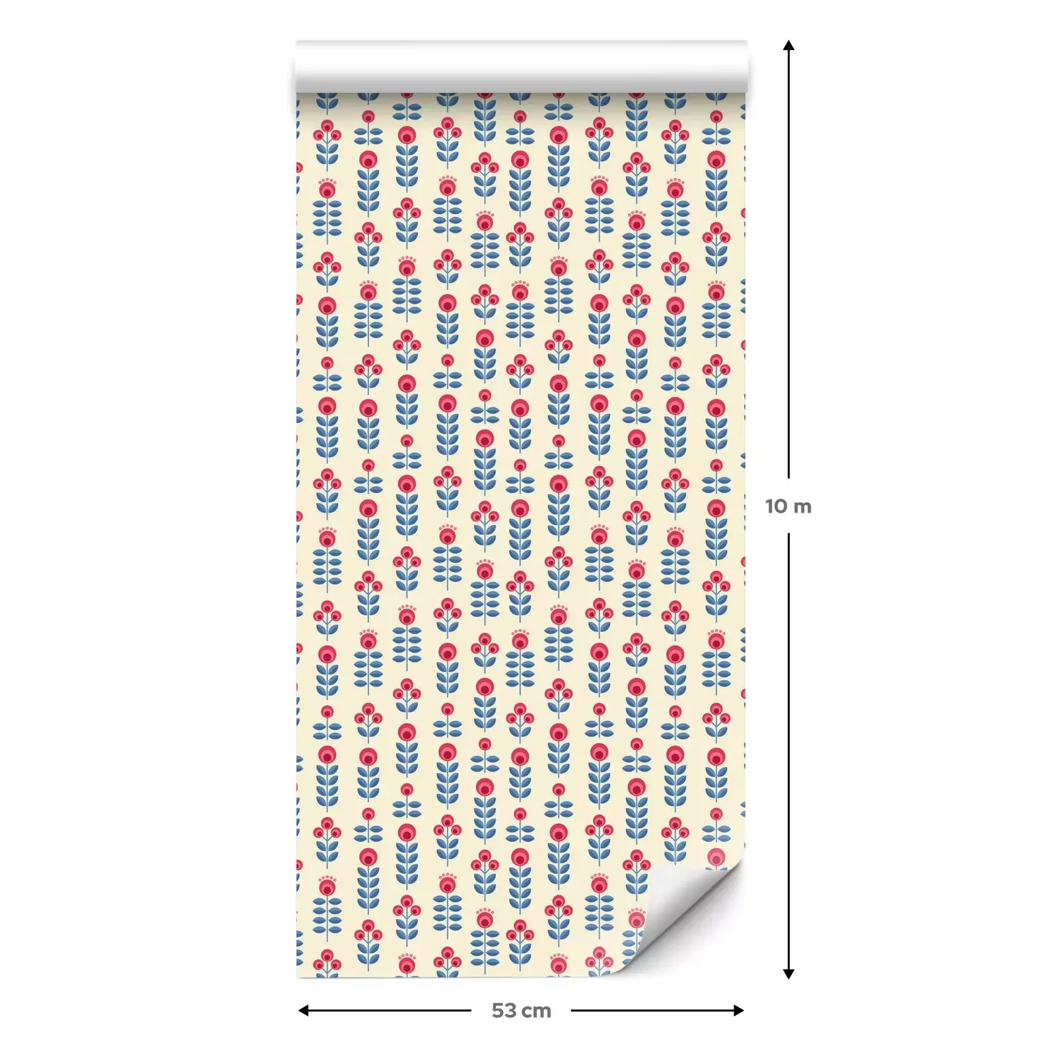 Eine Standard-Tapetenrolle hat die Maße 0,53 m x 10 m und deckt eine Wandfläche von etwa 5 m² ab.