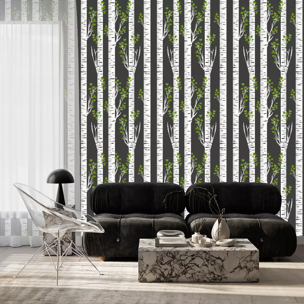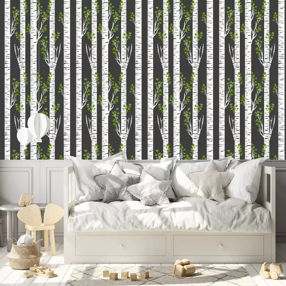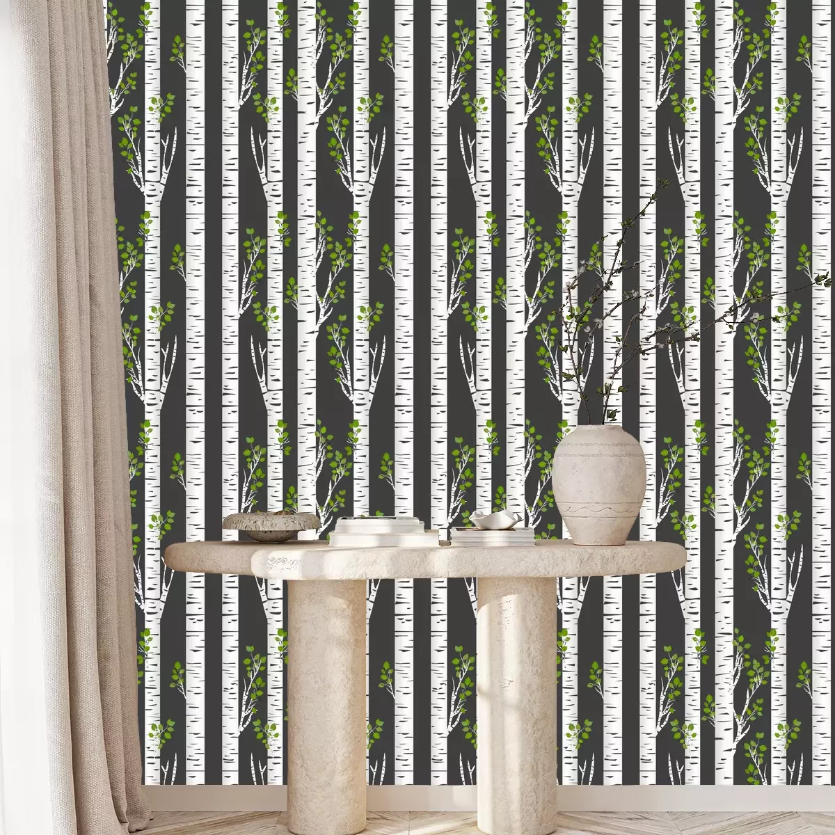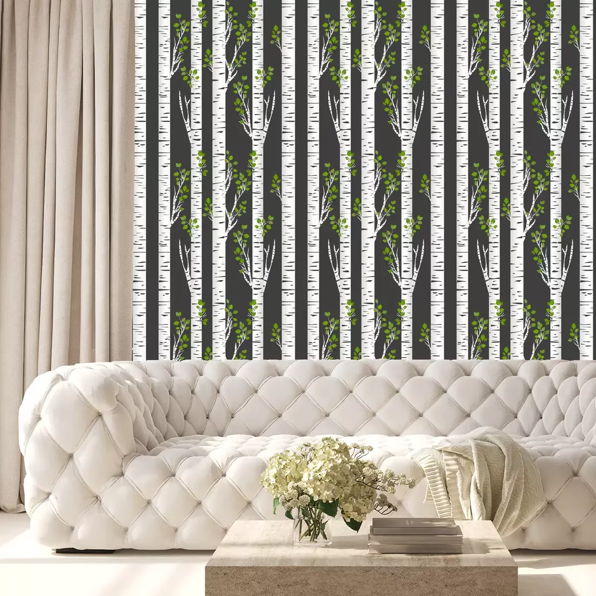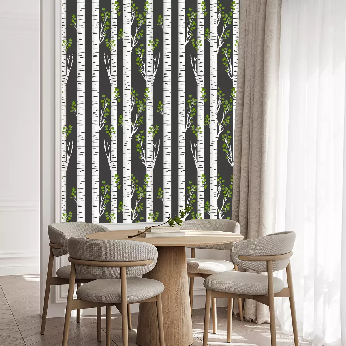 Birkenwald und Vögel im FlugTapete