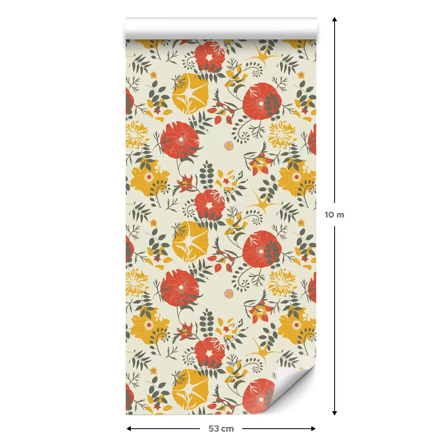 Eine Standard-Tapetenrolle hat die Maße 0,53 m x 10 m und deckt eine Wandfläche von etwa 5 m² ab.