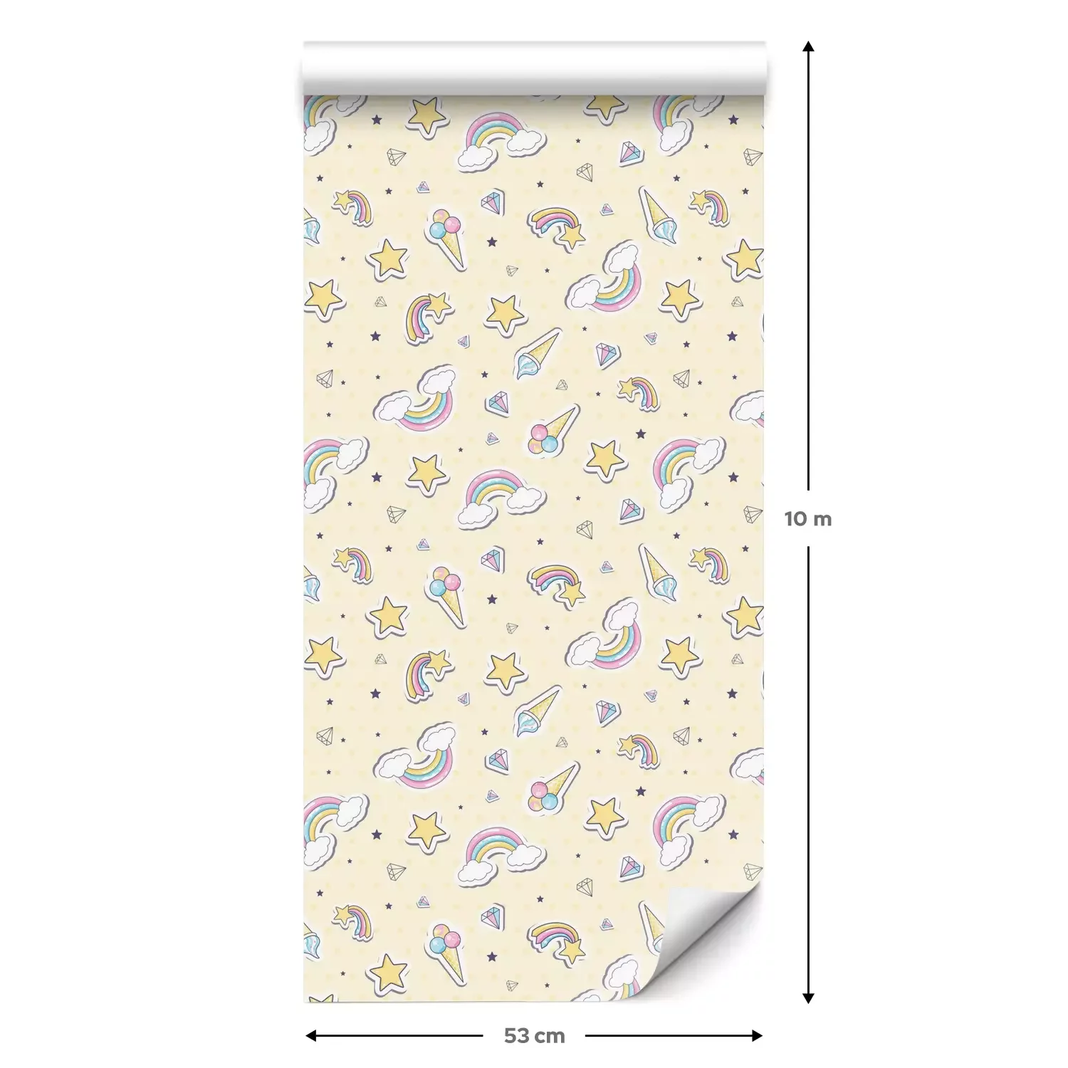Eine Standard-Tapetenrolle hat die Maße 0,53 m x 10 m und deckt eine Wandfläche von etwa 5 m² ab.