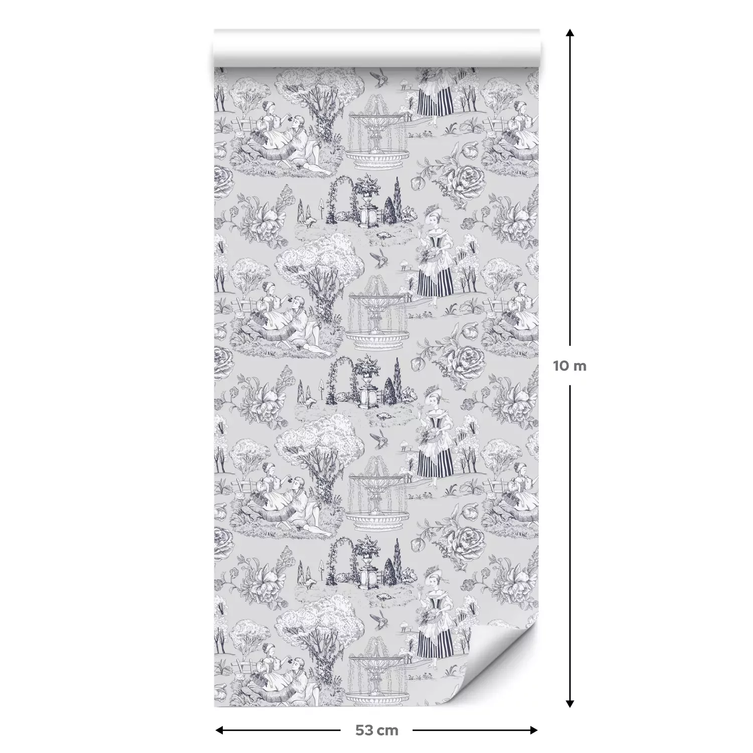 Eine Standard-Tapetenrolle hat die Maße 0,53 m x 10 m und deckt eine Wandfläche von etwa 5 m² ab.