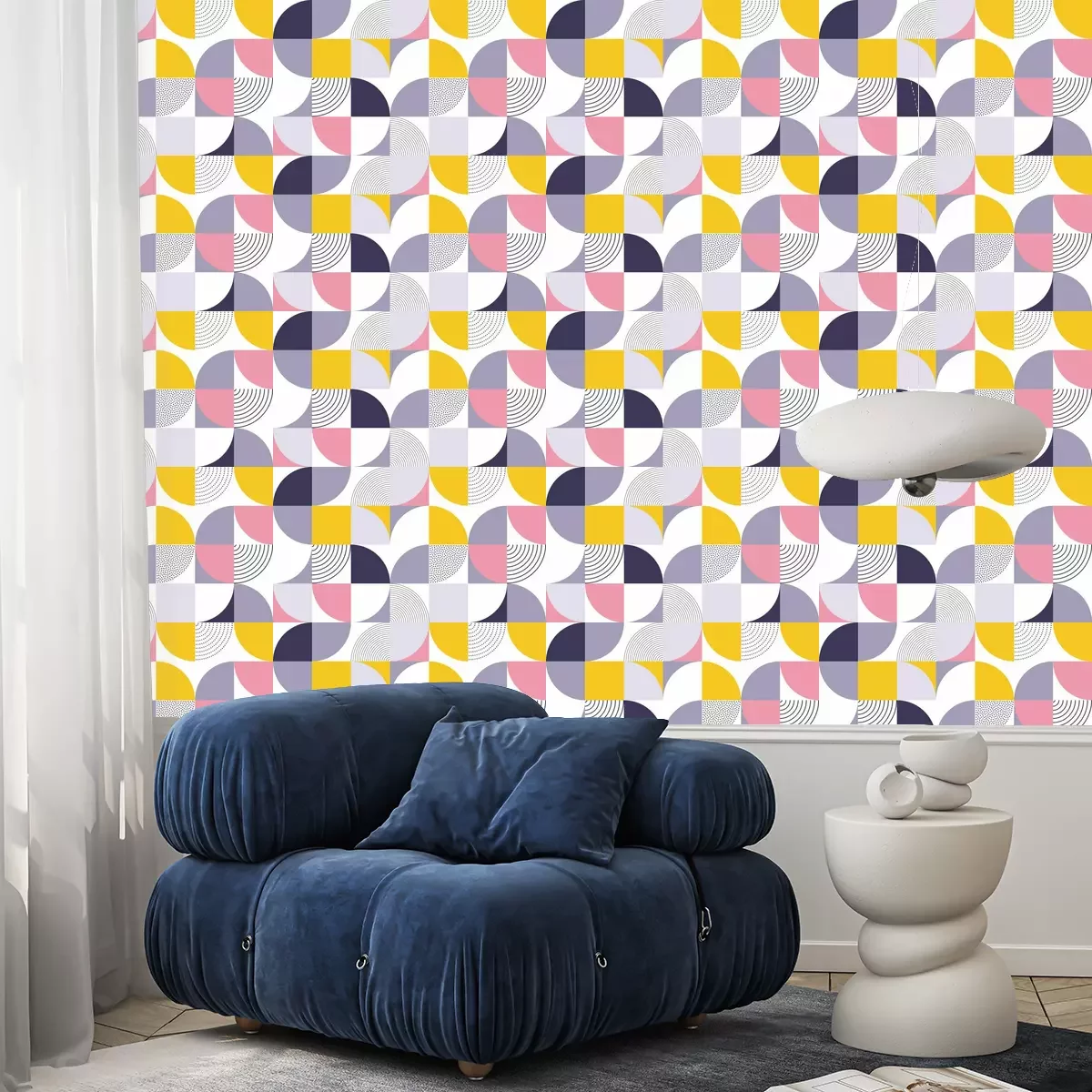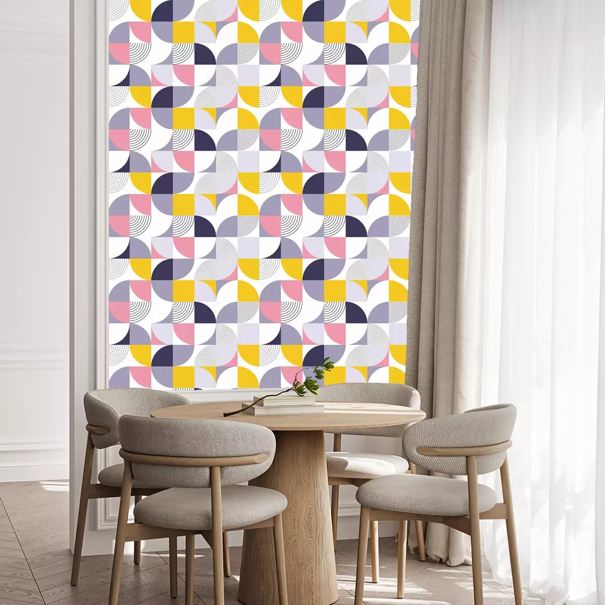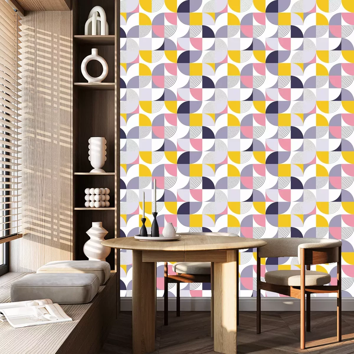 Tapete Geometrischer Mustervektorhintergrund mit skandinavischer abstrakter Farbe oder Schweizer Geometriedrucken von Rechtecken, Quadraten und Kreisen formen Design