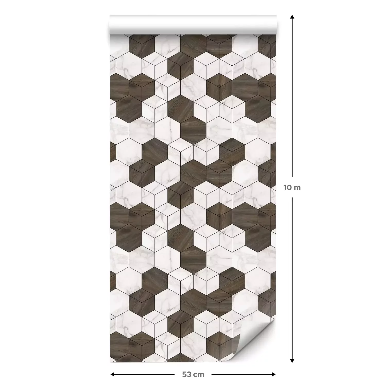 Eine Standard-Tapetenrolle hat die Maße 0,53 m x 10 m und deckt eine Wandfläche von etwa 5 m² ab.