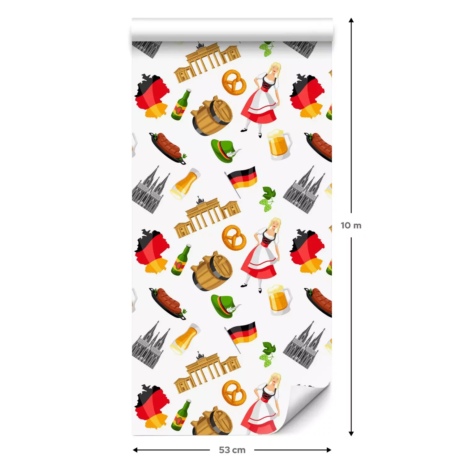 Eine Standard-Tapetenrolle hat die Maße 0,53 m x 10 m und deckt eine Wandfläche von etwa 5 m² ab.