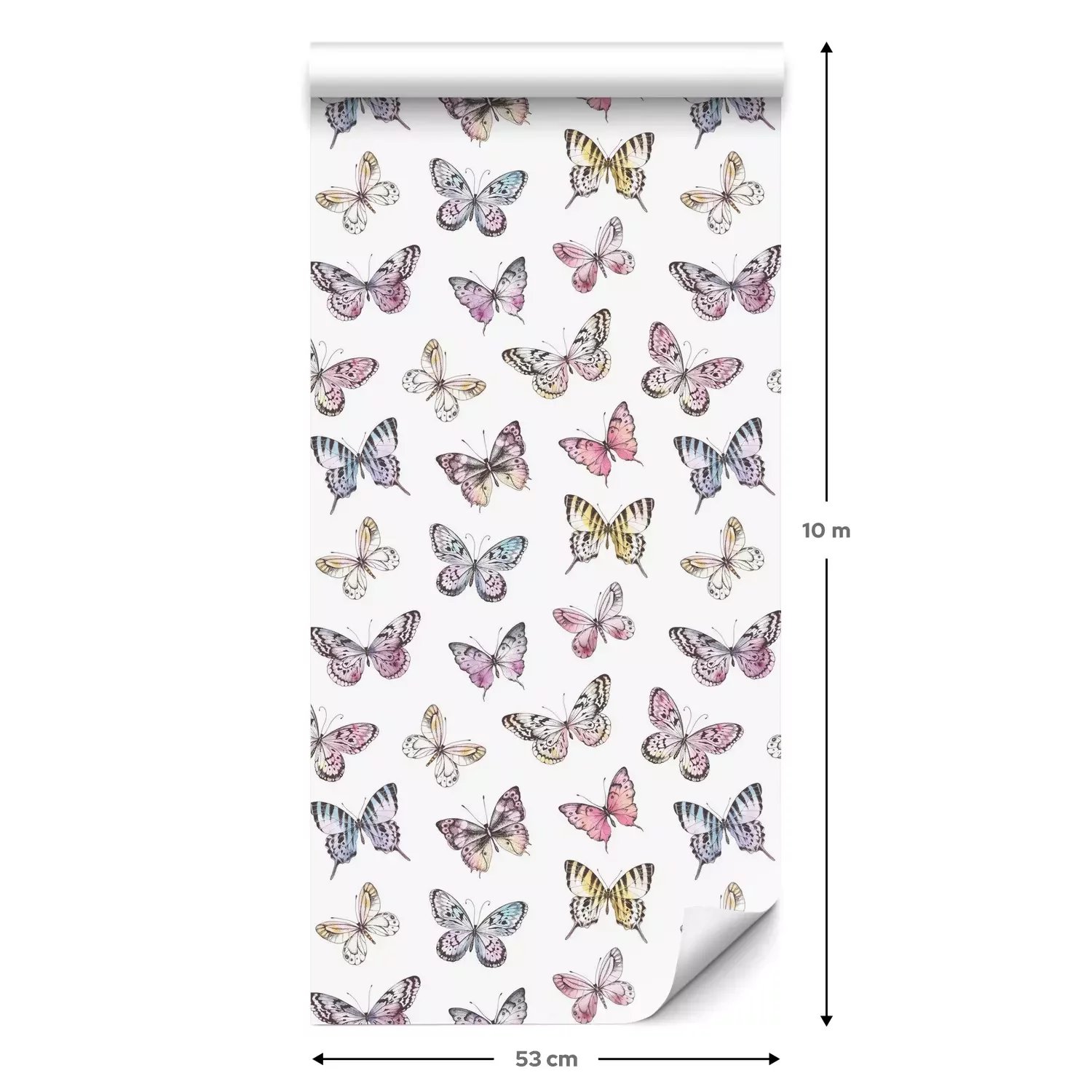 Eine Standard-Tapetenrolle hat die Maße 0,53 m x 10 m und deckt eine Wandfläche von etwa 5 m² ab.