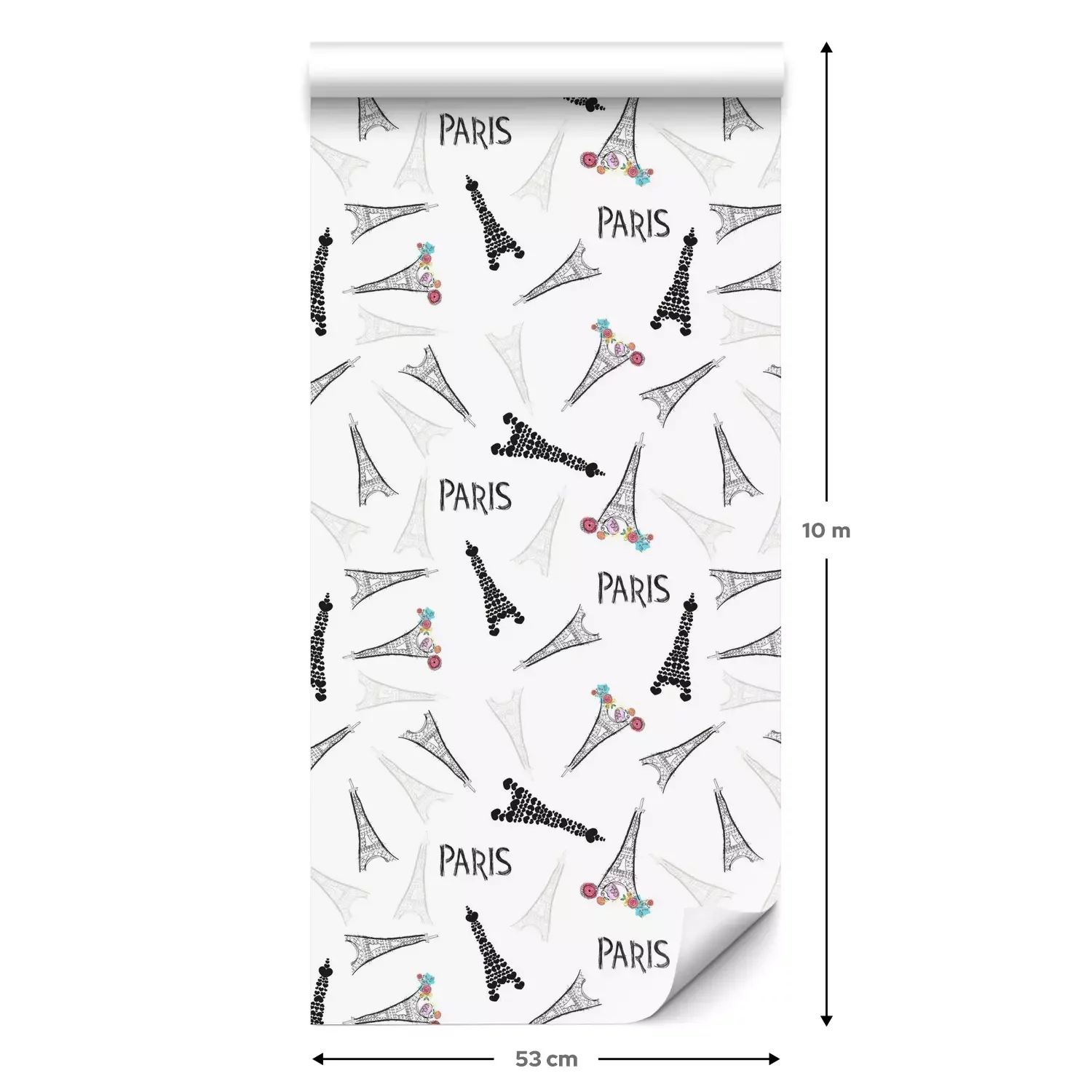 Eine Standard-Tapetenrolle hat die Maße 0,53 m x 10 m und deckt eine Wandfläche von etwa 5 m² ab.
