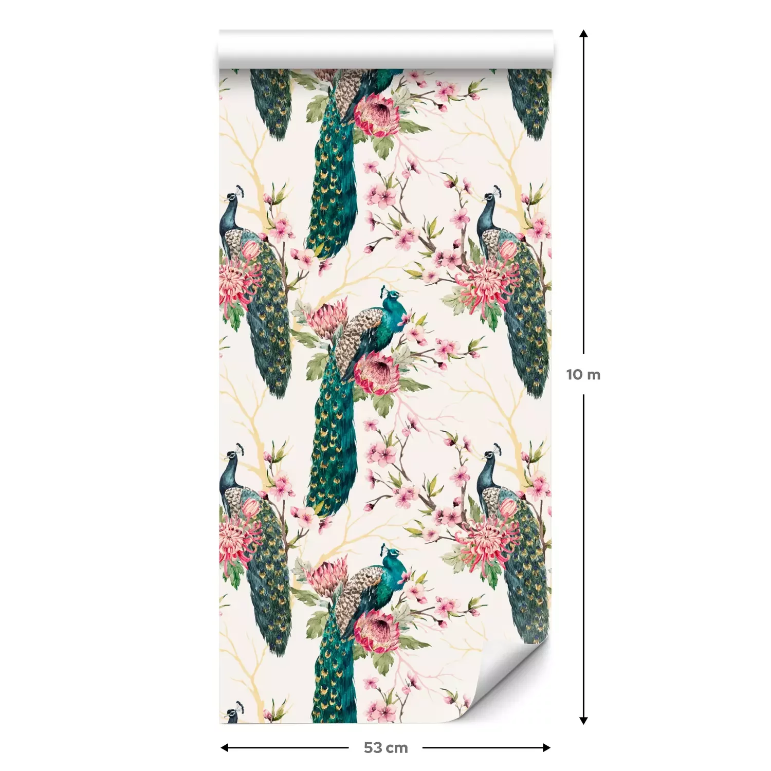 Eine Standard-Tapetenrolle hat die Maße 0,53 m x 10 m und deckt eine Wandfläche von etwa 5 m² ab.