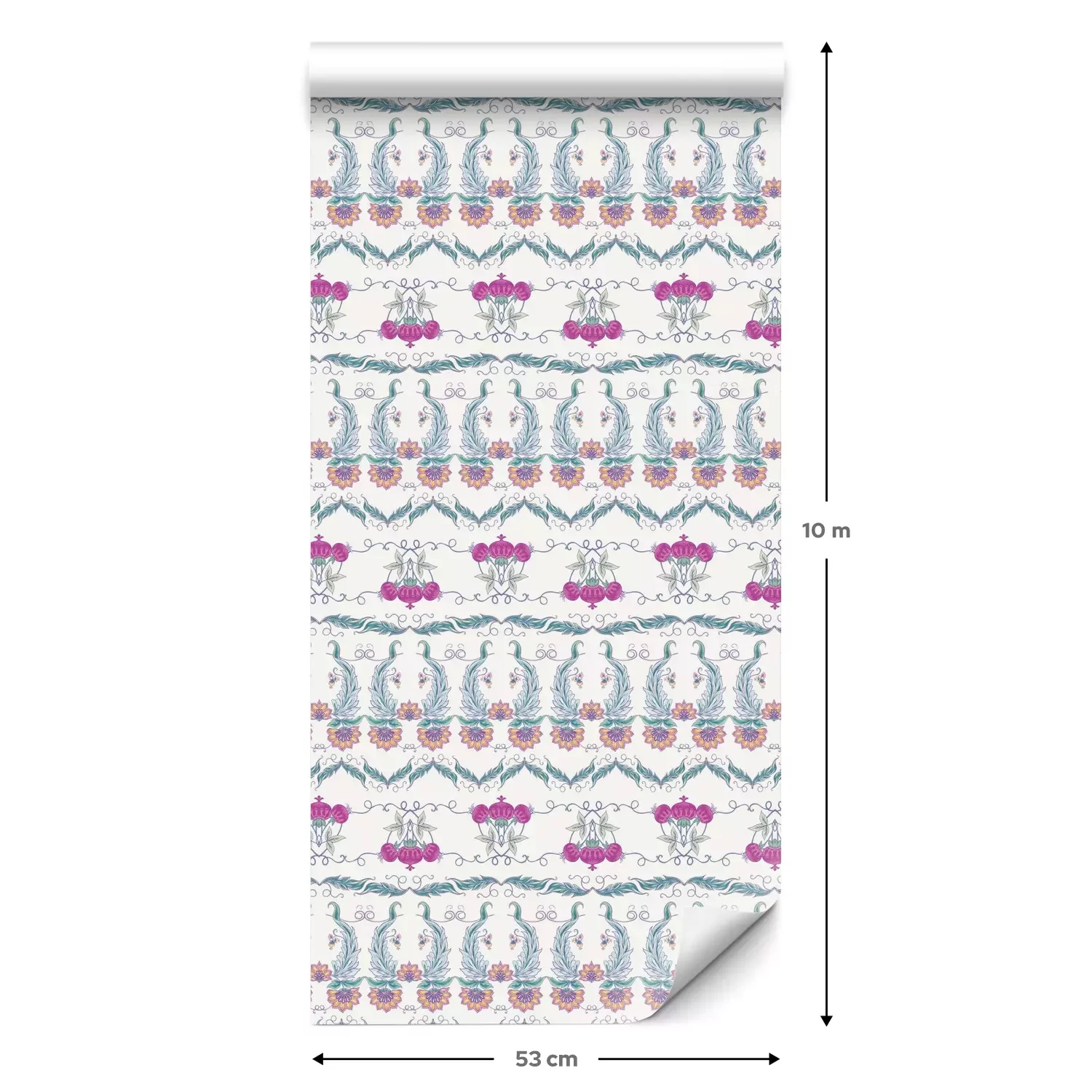 Eine Standard-Tapetenrolle hat die Maße 0,53 m x 10 m und deckt eine Wandfläche von etwa 5 m² ab.