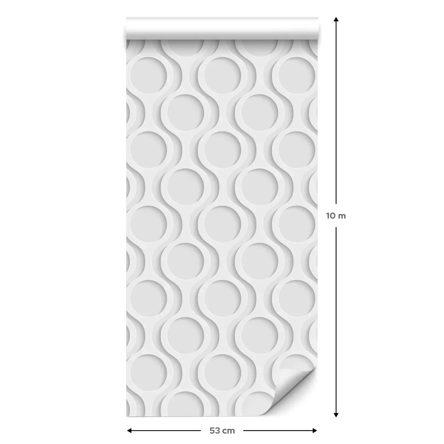 Eine Standard-Tapetenrolle hat die Maße 0,53 m x 10 m und deckt eine Wandfläche von etwa 5 m² ab.