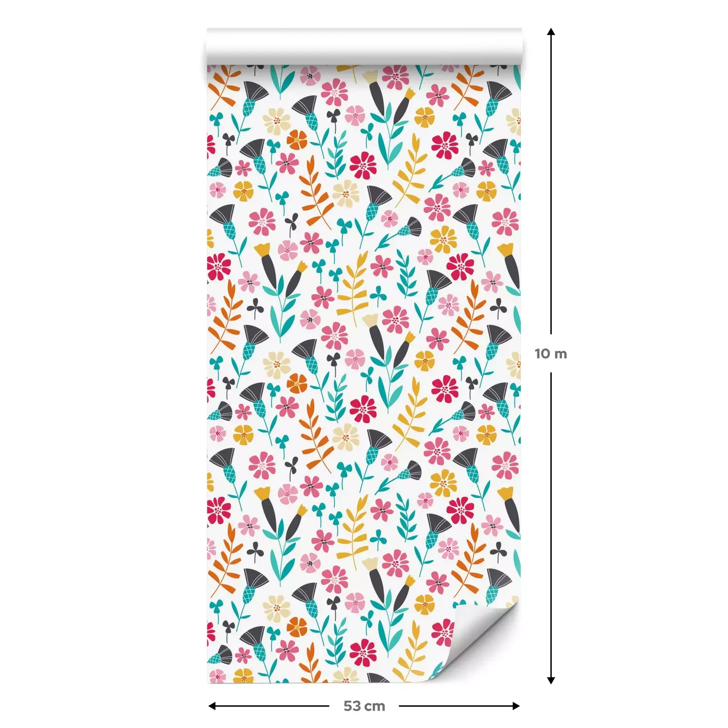 Eine Standard-Tapetenrolle hat die Maße 0,53 m x 10 m und deckt eine Wandfläche von etwa 5 m² ab.
