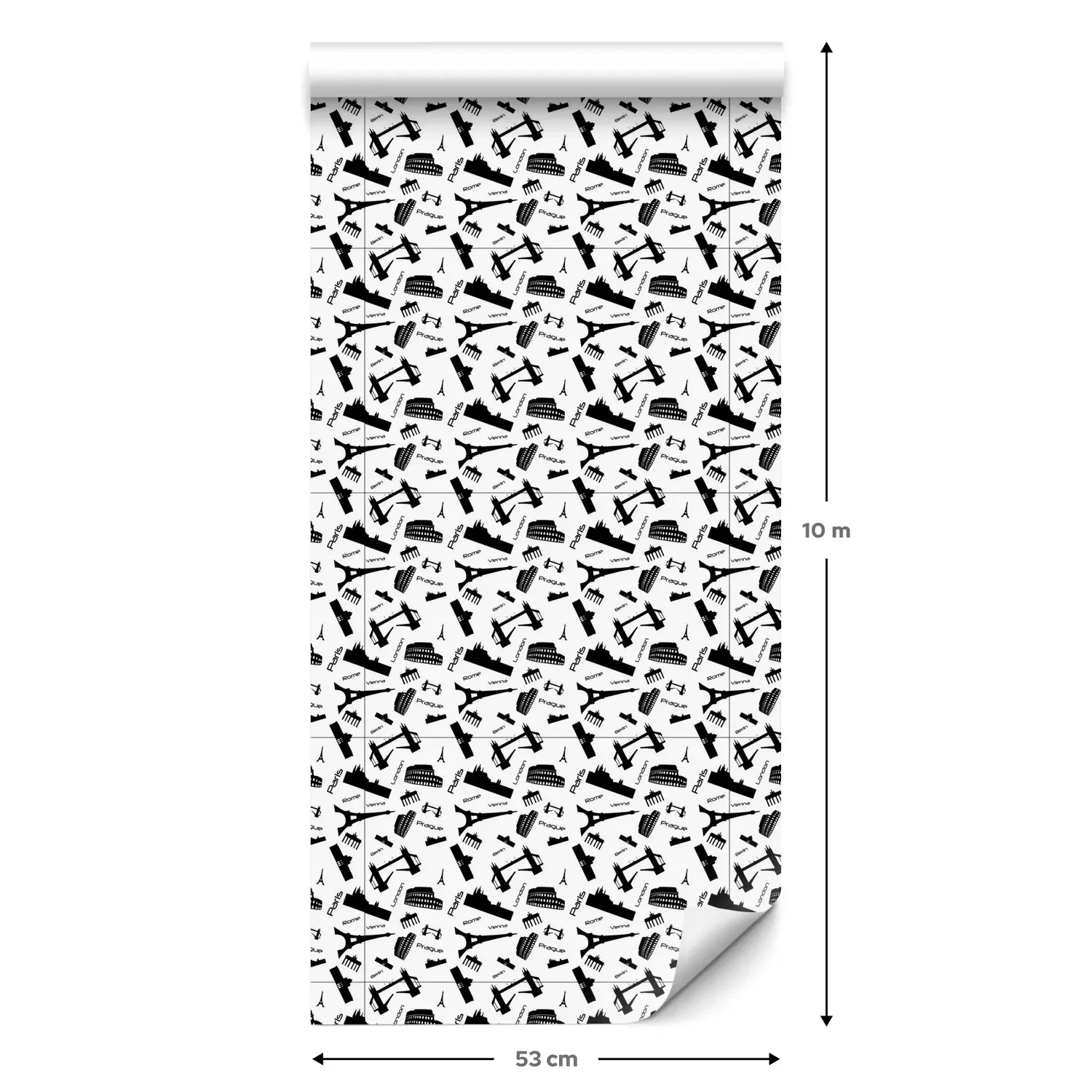 Eine Standard-Tapetenrolle hat die Maße 0,53 m x 10 m und deckt eine Wandfläche von etwa 5 m² ab.
