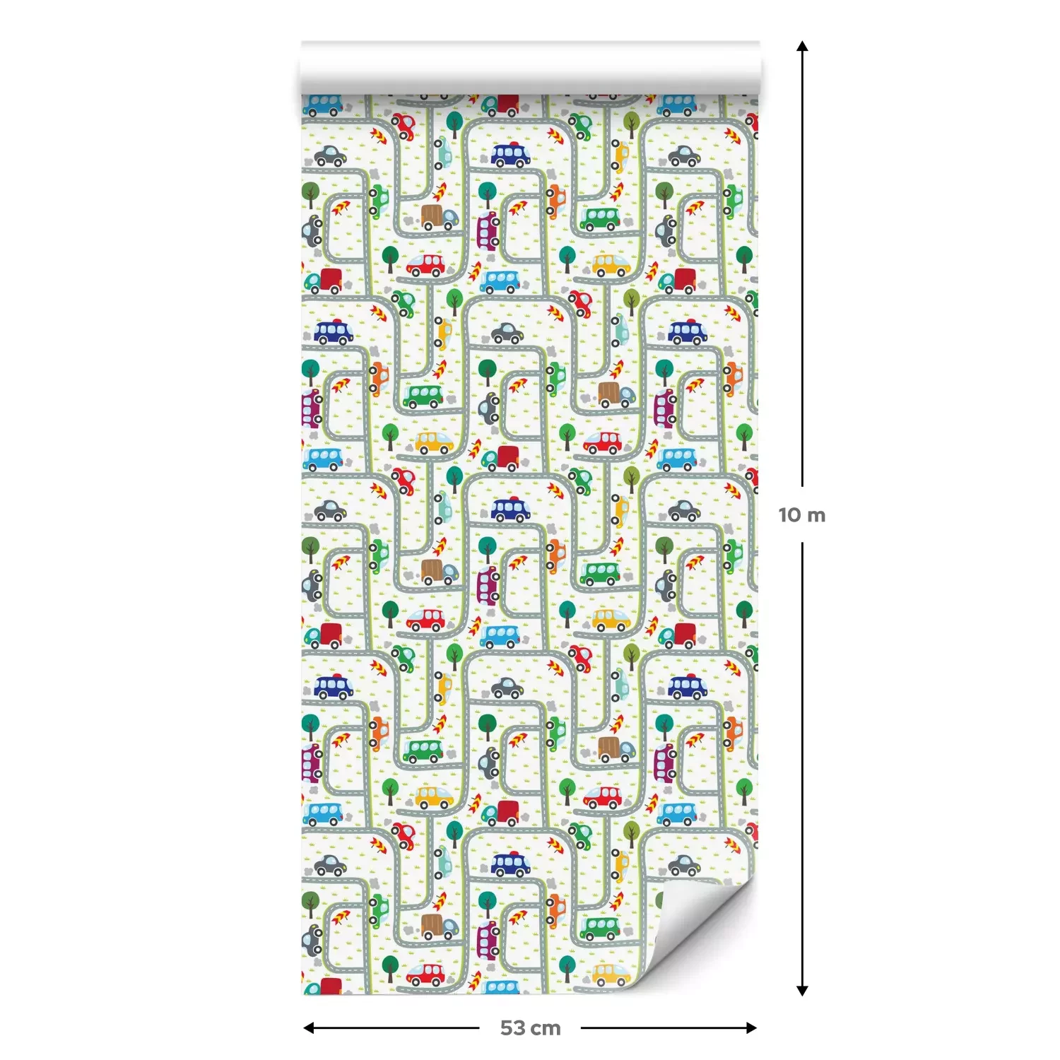 Eine Standard-Tapetenrolle hat die Maße 0,53 m x 10 m und deckt eine Wandfläche von etwa 5 m² ab.
