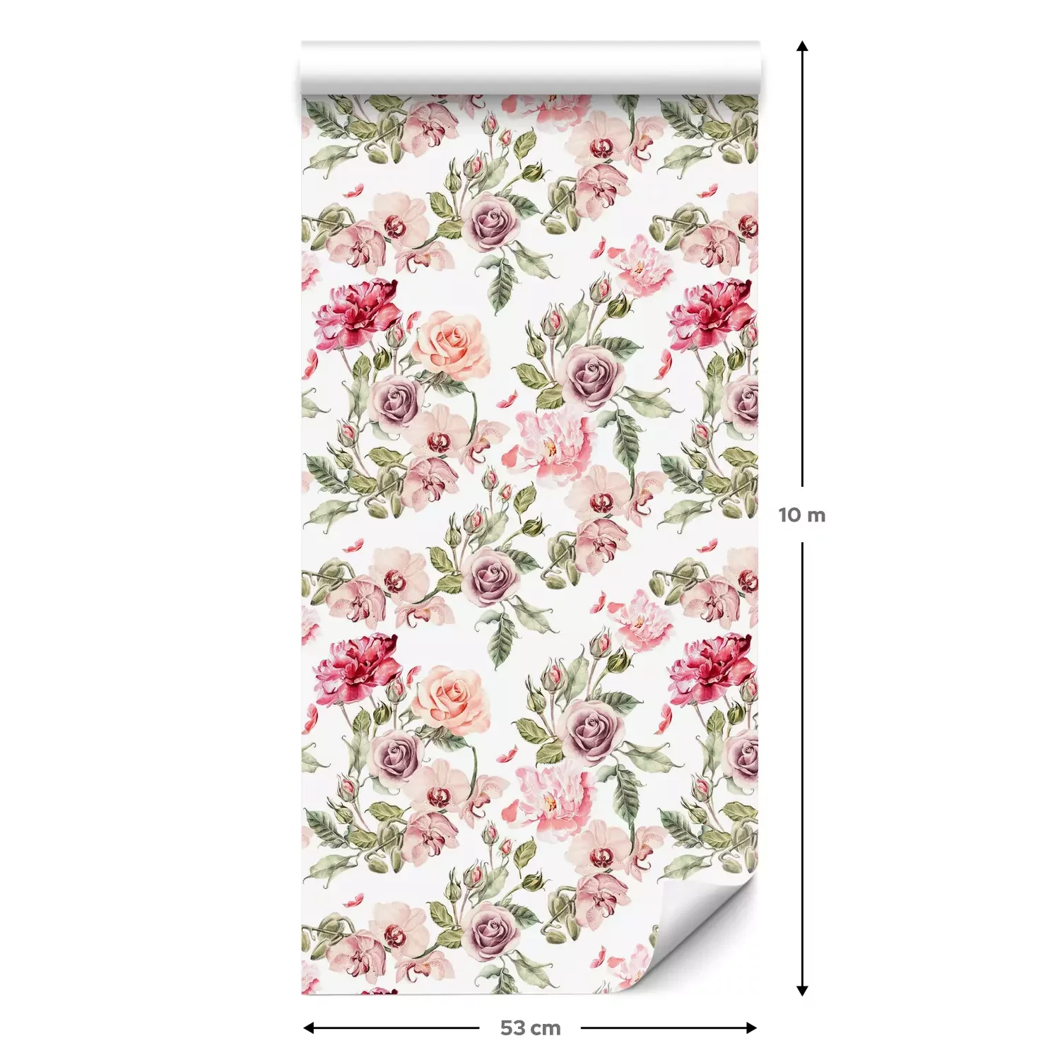 Eine Standard-Tapetenrolle hat die Maße 0,53 m x 10 m und deckt eine Wandfläche von etwa 5 m² ab.