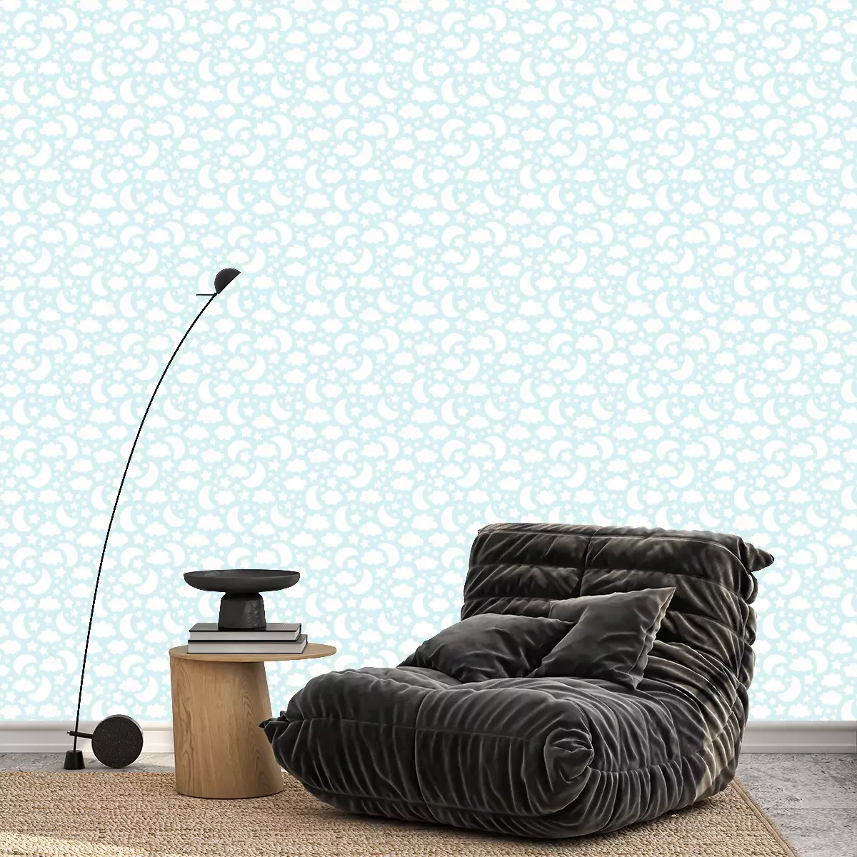 Tapete Nahtloses Muster des Vektors mit Silhouetten des Mondes, der Wolke und der Sterne.  Nettes Baby, Kinderhintergrundillustration.