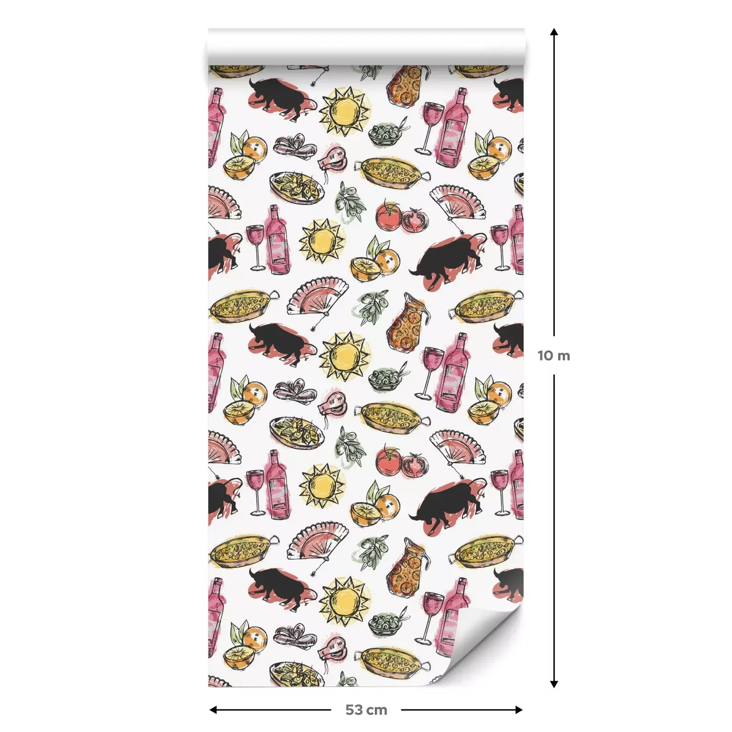 Eine Standard-Tapetenrolle hat die Maße 0,53 m x 10 m und deckt eine Wandfläche von etwa 5 m² ab.