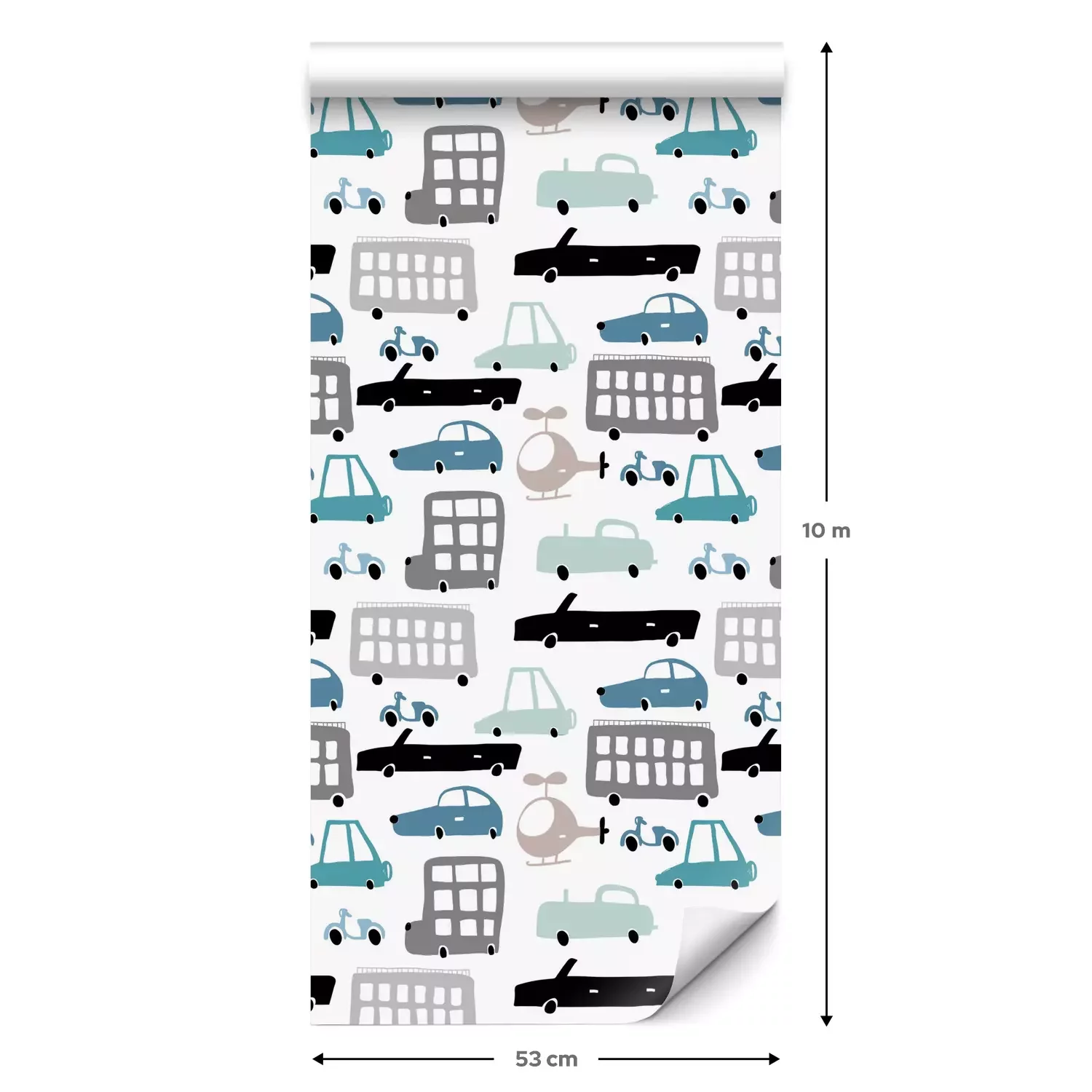 Eine Standard-Tapetenrolle hat die Maße 0,53 m x 10 m und deckt eine Wandfläche von etwa 5 m² ab.
