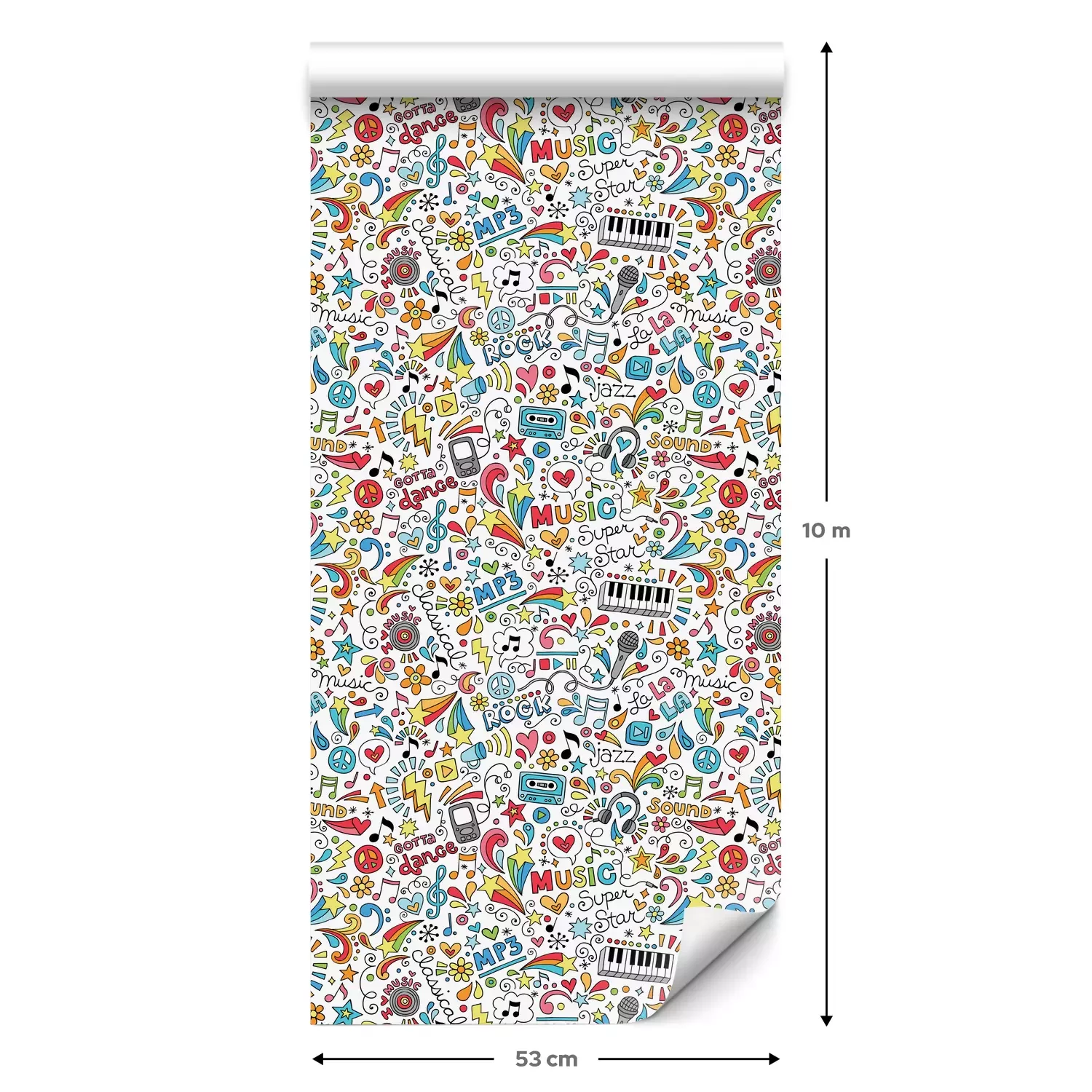 Eine Standard-Tapetenrolle hat die Maße 0,53 m x 10 m und deckt eine Wandfläche von etwa 5 m² ab.