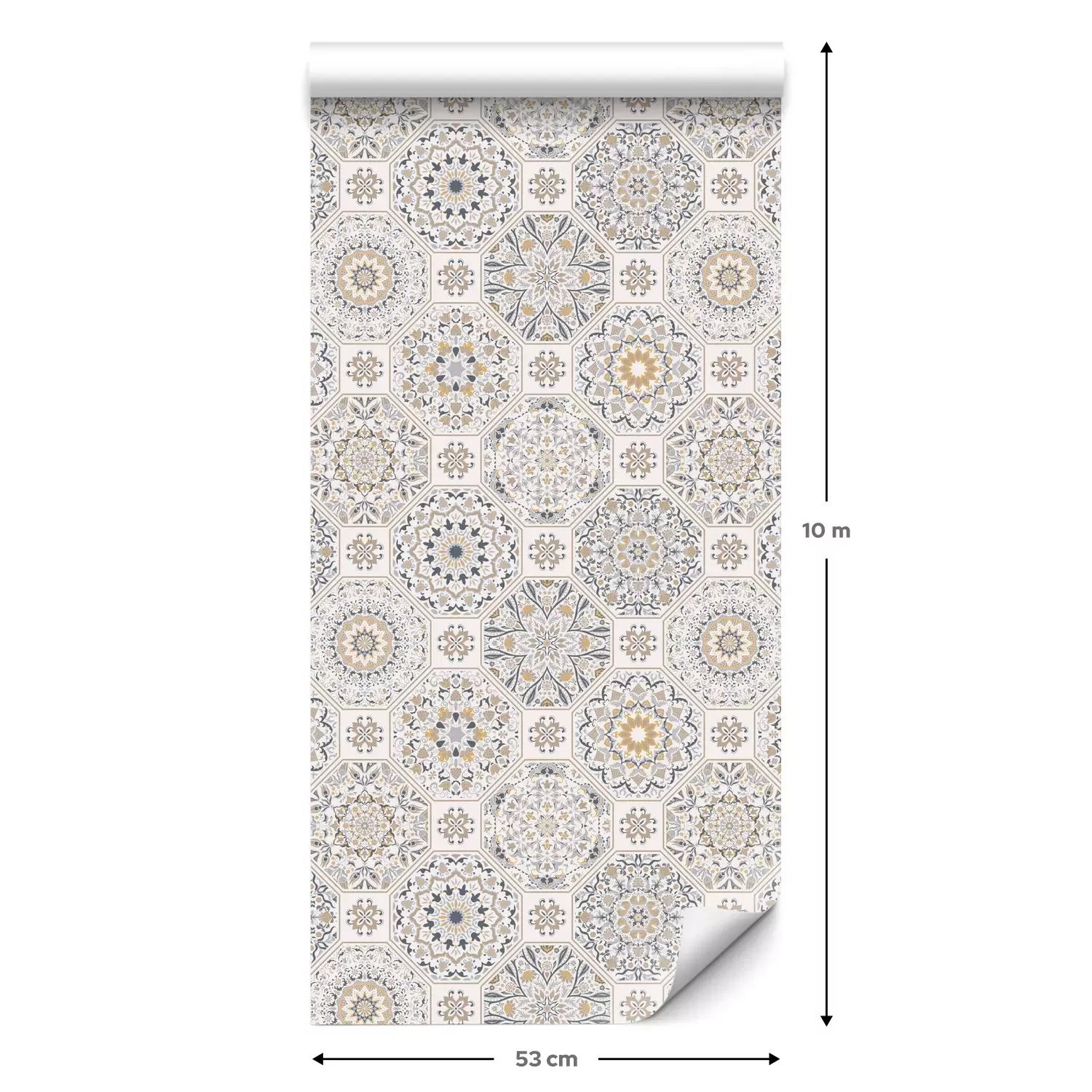 Eine Standard-Tapetenrolle hat die Maße 0,53 m x 10 m und deckt eine Wandfläche von etwa 5 m² ab.