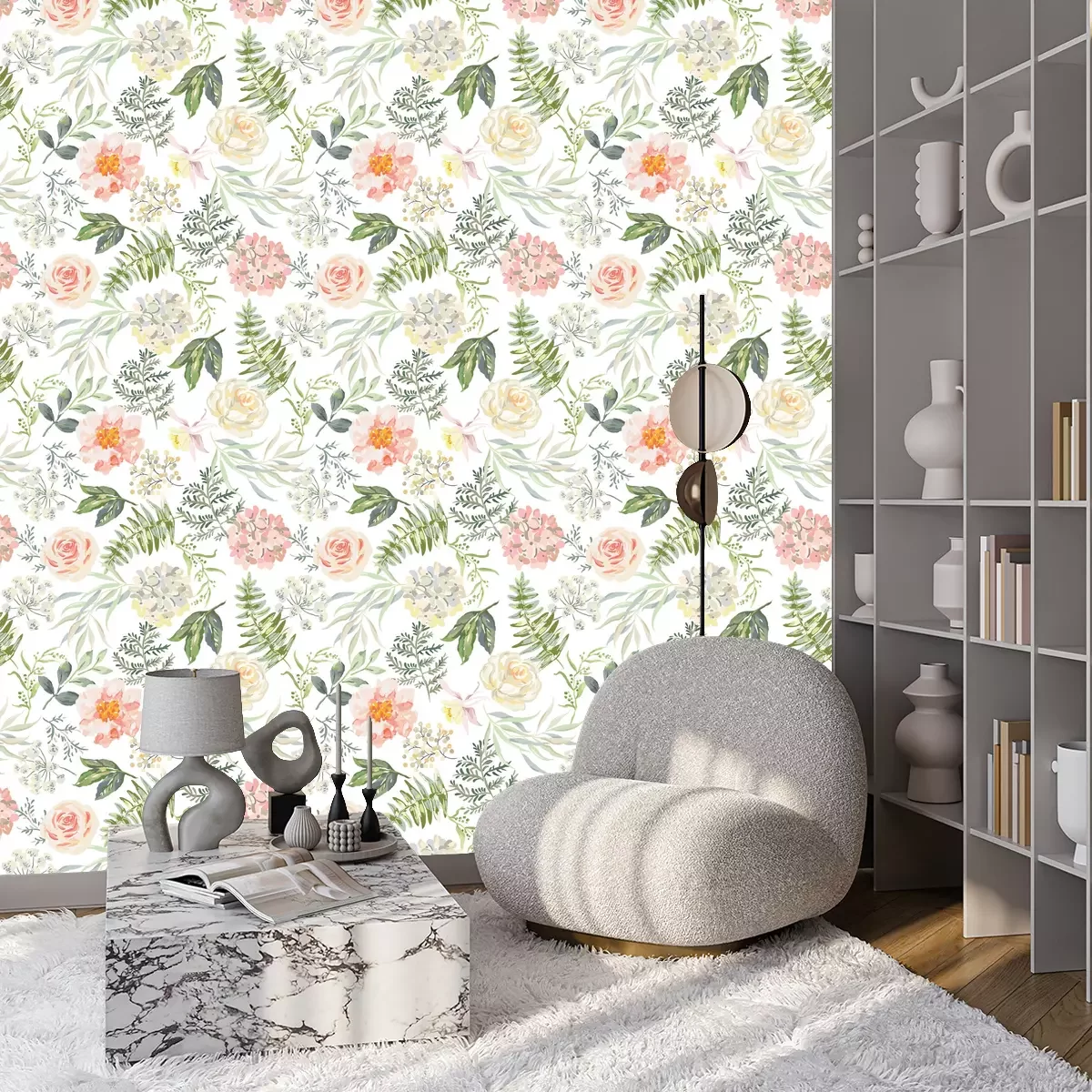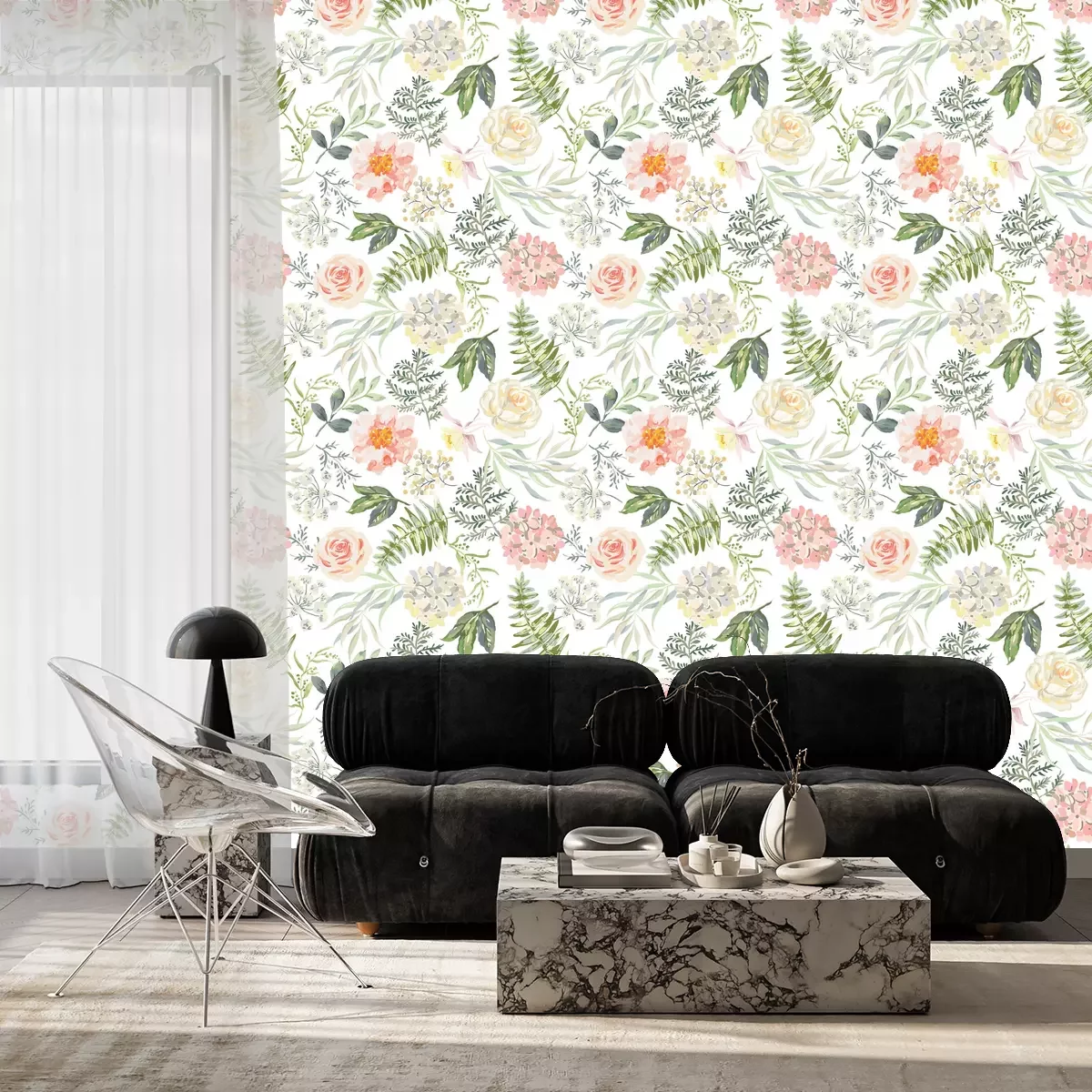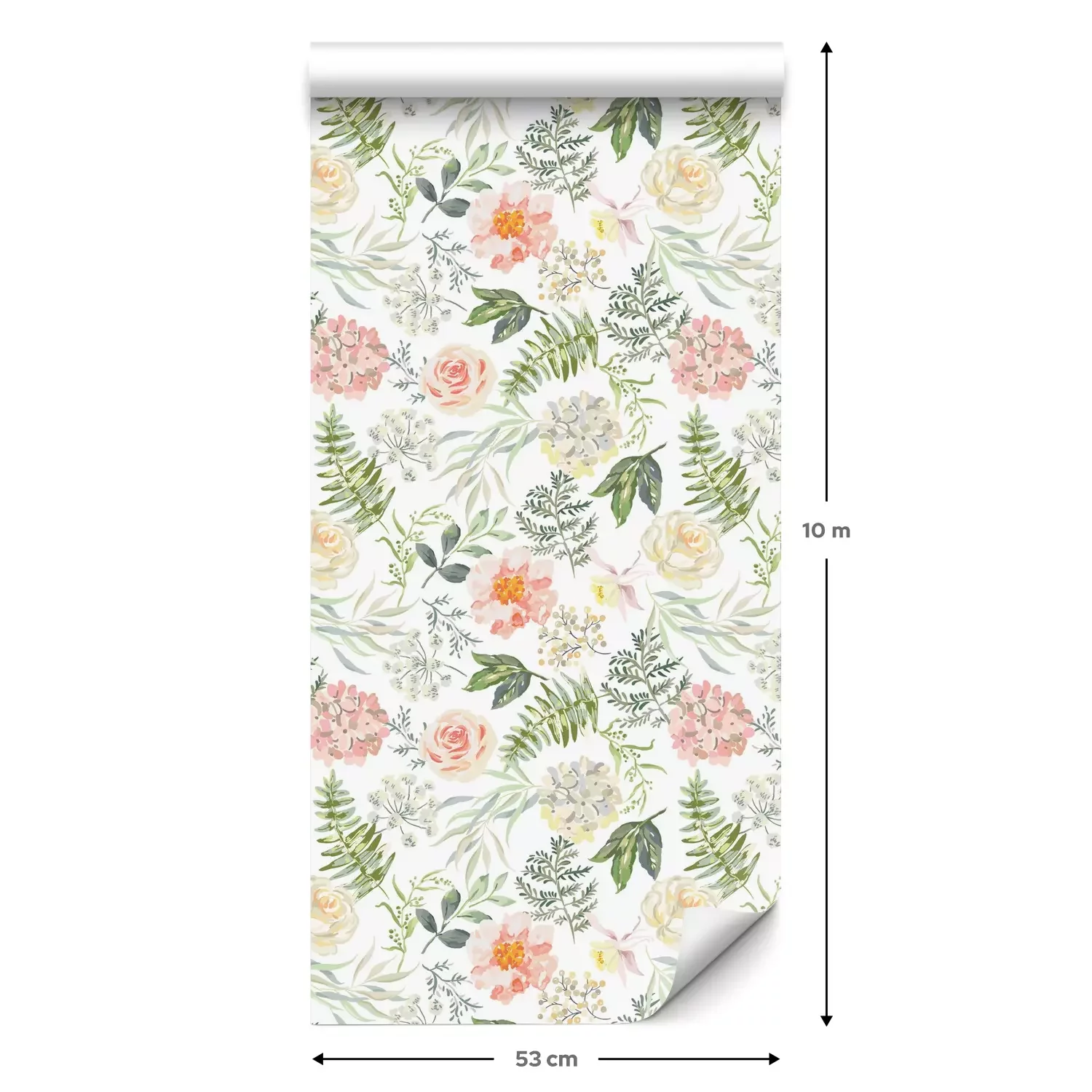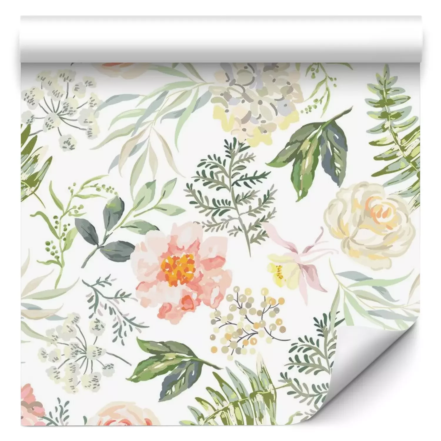 Tapete Pfingstrosen umgeben von Blumen und Bl?ttern