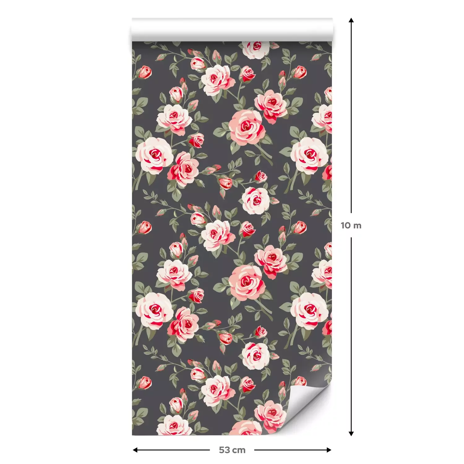 Eine Standard-Tapetenrolle hat die Maße 0,53 m x 10 m und deckt eine Wandfläche von etwa 5 m² ab.