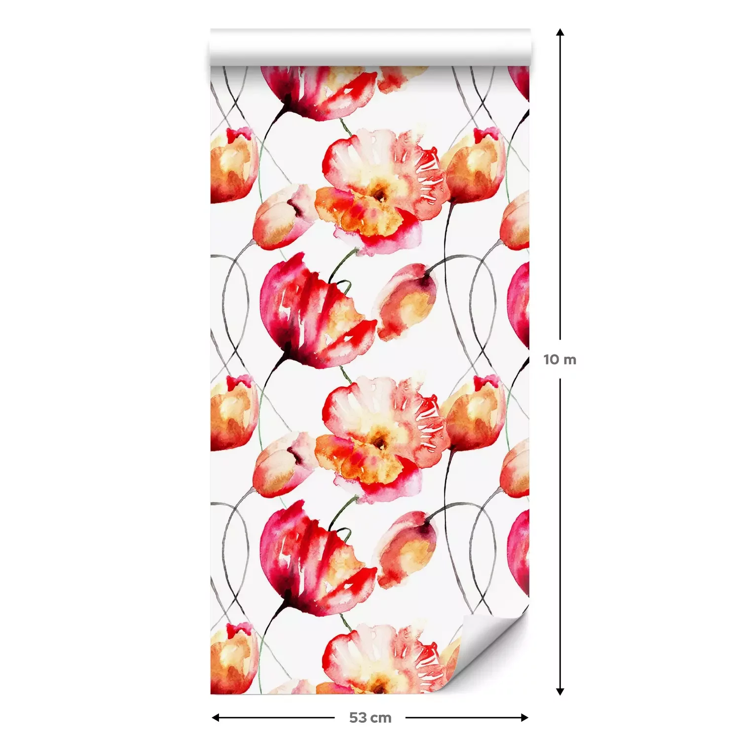 Eine Standard-Tapetenrolle hat die Maße 0,53 m x 10 m und deckt eine Wandfläche von etwa 5 m² ab.