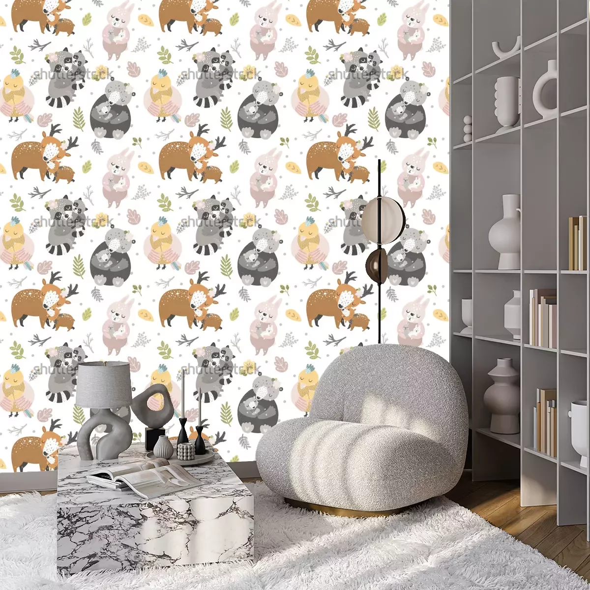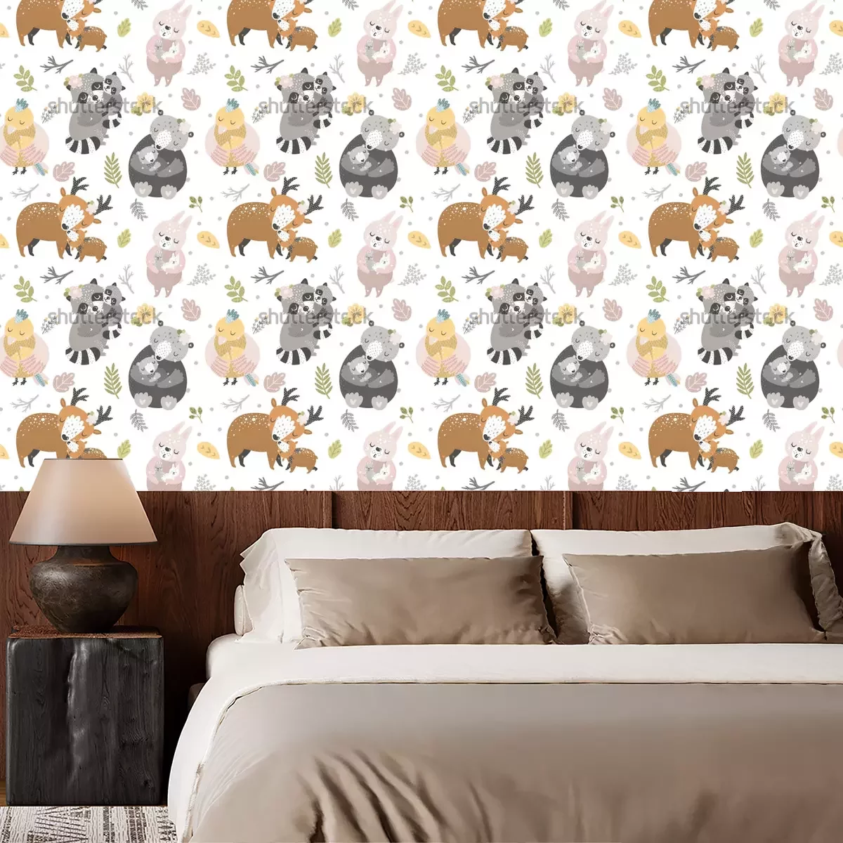 Diese für Kinder geeignete Tapete mit Waldtieren ist ein entzückendes Muster, das die Kleinen in die magische Welt der Natur entführt. Voller Bären, Kaninchen, Rehe, Vögel und Waschbären, die kleine Kinder in ihren Armen halten, bietet dieses Design nicht nur einen ästhetischen Aspekt, sondern auch ein warmes und fröhliches Interieur. All dies macht sie zu einer äußerst bezaubernden Tapete. Waldtiere eignen sich hervorragend für Kinderzimmer. Ihr Muster regt die Fantasie der Kleinen an und verleiht ihrem Raum eine gemütliche Waldatmosphäre. Sie kann sowohl im Jungen- als auch im Mädchenzimmer erfolgreich verwendet werden und verleiht ihm Charme und Freude. Zudem harmoniert die Tapete "Waldtiere" hervorragend mit verschiedenen Einrichtungsstilen. Sie kann mit dem minimalistischen skandinavischen Stil kombiniert werden, in dem helle Farben und schlichte Formen dominieren, um dieser zurückhaltenden Ästhetik kindlichen Charme zu verleihen. Die TapeteKaninchen, Hirsche und Bären passt auch gut zum Boho-Stil, der sich durch eine subtile Kombination von Mustern, Texturen und Farben auszeichnet. In Kombination mit natürlichen Materialien und ethnischen Accessoires schafft diese Dekoration eine einzigartige Atmosphäre im Kinderzimmer. Vögel, Bären, entzückende Waschbären oder Kaninchen? Tapeten wie diese verbinden all diese Motive perfekt! Einer der Hauptvorteile dieser Kindertapete Waldtiere ist ihre Vielseitigkeit. Die Waldtiere können sowohl im Babyzimmer als auch im Zimmer älterer Kinder verwendet werden und behalten in jeder Entwicklungsphase ihren bezaubernden Zauber. Die Waldtiere Tapete schafft eine freundliche und ruhige Atmosphäre, die Kreativität und Entspannung fördert. Dieses Muster regt die Fantasie an und fördert das Interesse des Kindes an Natur und Tieren. Ein weiterer Vorteil ist ihre Langlebigkeit und leichte Reinigung. Aus hochwertigen Materialien hergestellt, ist sie abwischbar und widerstandsfähig gegen mechanische Beschädigungen. So kann das Kleinkind sein schönes Zimmer genießen, während die Eltern sich keine Sorgen über schnellen Verschleiß oder schwierige Reinigung machen müssen.