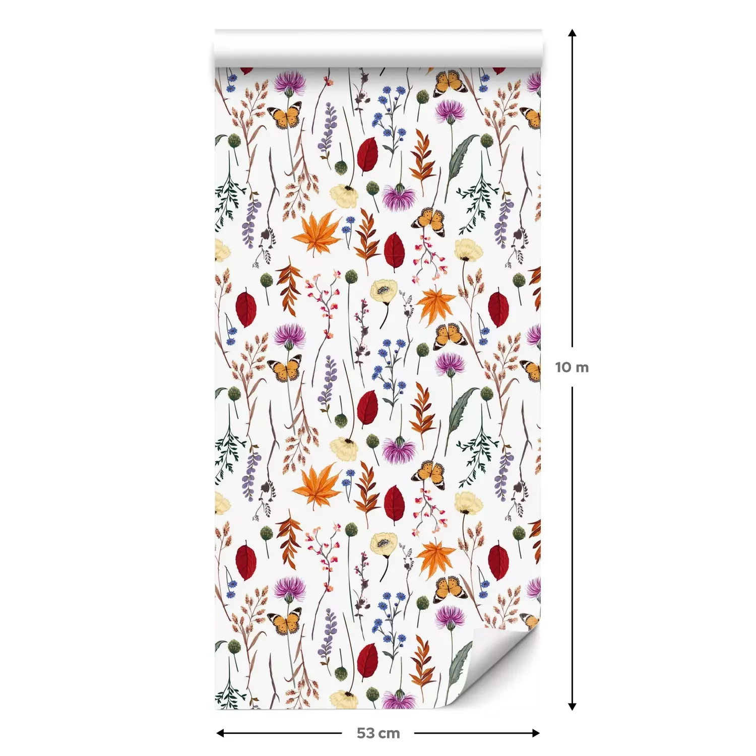 Eine Standard-Tapetenrolle hat die Maße 0,53 m x 10 m und deckt eine Wandfläche von etwa 5 m² ab.