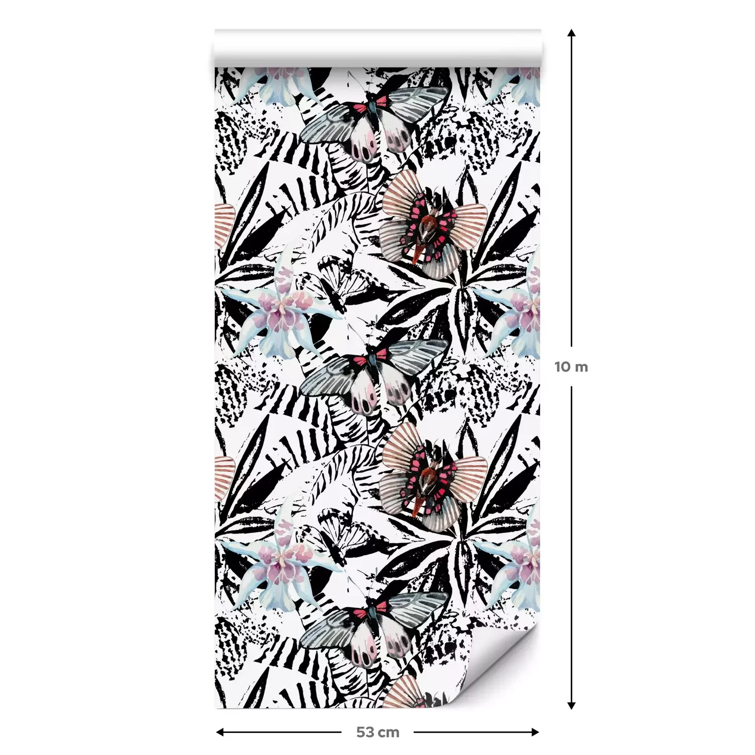 Eine Standard-Tapetenrolle hat die Maße 0,53 m x 10 m und deckt eine Wandfläche von etwa 5 m² ab.