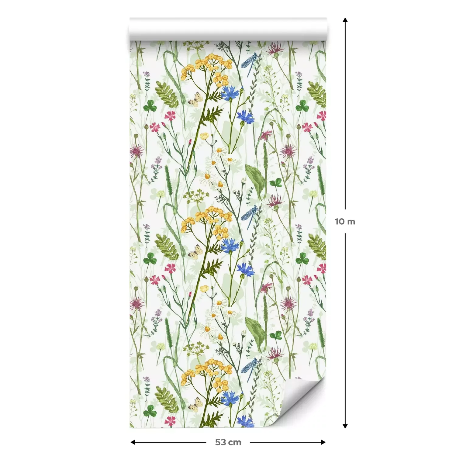 Eine Standard-Tapetenrolle hat die Maße 0,53 m x 10 m und deckt eine Wandfläche von etwa 5 m² ab.