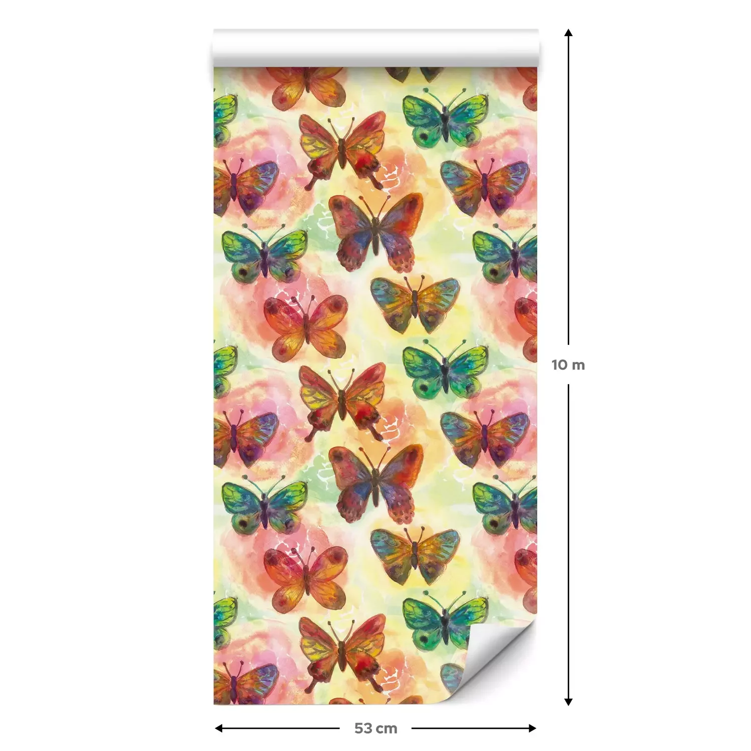 Eine Standard-Tapetenrolle hat die Maße 0,53 m x 10 m und deckt eine Wandfläche von etwa 5 m² ab.