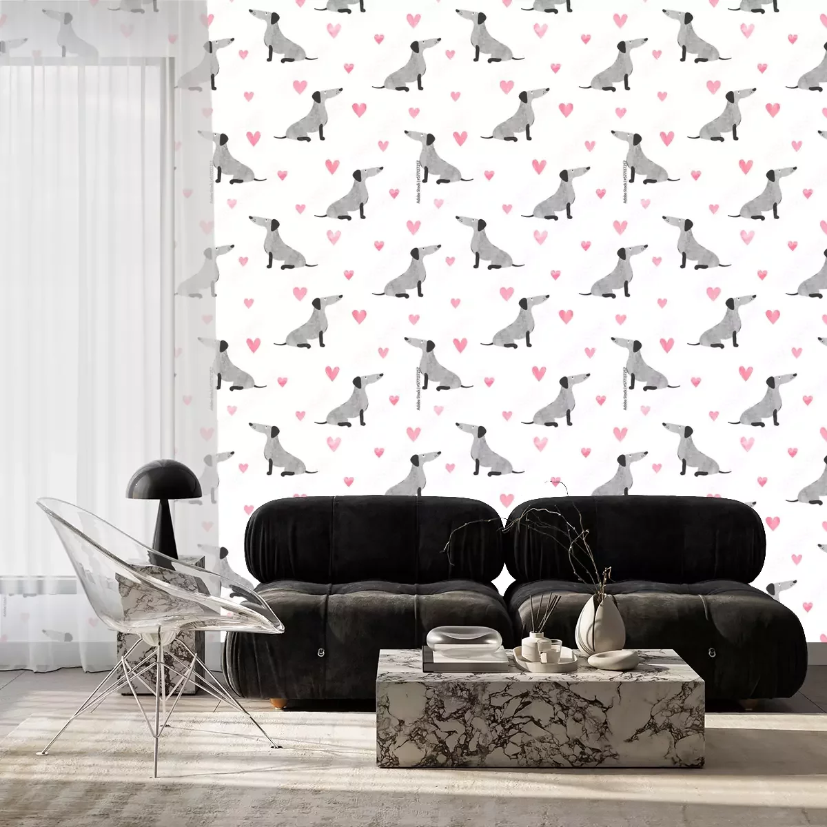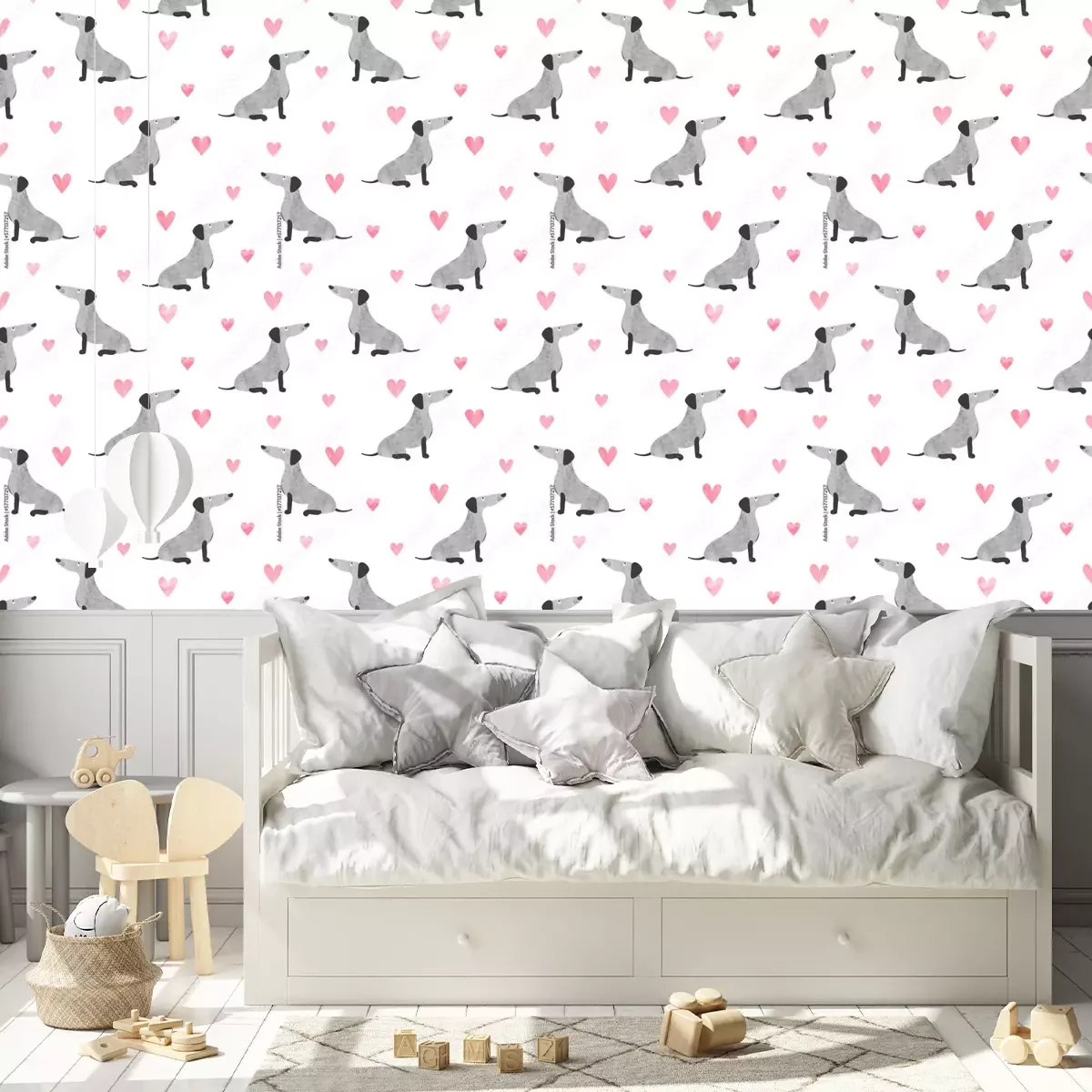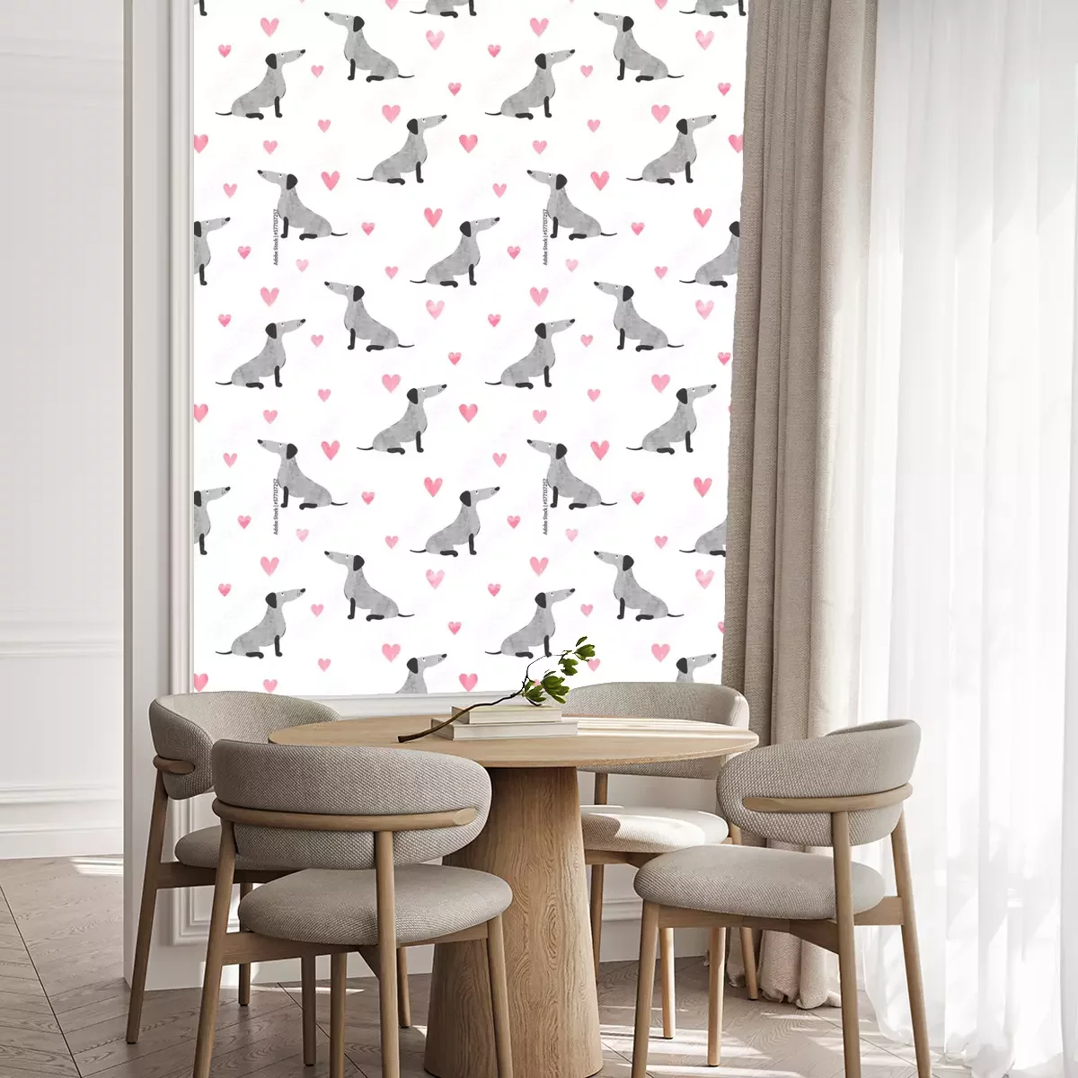 Entdecken Sie unsere magischen Tapeten Hunde, die das Kinderzimmer auf eine höhere Ebene des Charmes und der Freude bringen! Unsere einzigartige Tapete mit grauen Dackeln, die mit Aquarellfarben gemalt und von rosa Herzen umgeben sind, ist ein wahres Symbol der Liebe. Die zarten Hundemotive auf weißem Hintergrund schaffen eine unglaubliche Atmosphäre im Zimmer Ihres Kindes. Dies ist keine gewöhnliche Tapete. Dies ist ein Kunstwerk, das jedem Raum Leben einhaucht. Die mit Aquarellfarben gemalten Muster verleihen den Tapeten mit Hunden ein einzigartiges Aussehen, das Ihrem Kind Wärme und Geborgenheit vermittelt. Die Dackel sind so entzückend, dass es schwer ist, den Blick von ihnen abzuwenden! Die rosa Herzen, die sie umgeben, verleihen ihnen Charme und machen die Tapete Hunde noch außergewöhnlicher. Aber das ist noch nicht alles! Die Tapete Hundemotiv ist nicht nur schön und charmant. Ihre Anwendung im Kinderzimmer bringt viele Vorteile mit sich. Hunde stehen für Treue und Freundschaft, und die Präsenz dieser süßen Dackel an der Wand erinnert Ihr Kind an Werte wie Liebe, Fürsorge und Mitgefühl. Der weiße Hintergrund der Hunde – Tapete schafft Weite und erhellt den Raum optisch, wodurch ein idealer Ort zum Lernen, Spielen und Entspannen entsteht. Beleben Sie Ihre Einrichtung und schaffen Sie eine magische Atmosphäre im Zimmer Ihres Kindes mit unserer außergewöhnlichen Tapete Hunde. Lassen Sie Ihr Kleines in eine Welt des Charmes und der Liebe eintauchen, umgeben von lächelnden Dackeln und gemalten Herzen. Zudem sind unsere Hundetapeten leicht anzubringen, so dass Sie ihre Schönheit ohne unnötige Mühe genießen können. Dank der modernen Technologie ist einer der Vorteile der Tapete Hund, dass sie selbstklebend ist und keinen Klebstoff benötigt. Sie können sie einfach an der Wand anbringen und nach Ihren Vorlieben und Präferenzen anpassen. Die Hunde – Tapete ist die perfekte Lösung für beschäftigte Eltern, die eine schnelle und einfache Möglichkeit zur Verschönerung des Kinderzimmers suchen. Bestellen Sie noch heute unsere Tapeten Hunde und schaffen Sie einen magischen Raum für Ihr Kind! Verwandeln Sie das Zimmer Ihres Sprösslings in einen Ort voller Freude, Charme und Inspiration. Bieten Sie Ihrem Kind eine besondere Atmosphäre, in der es seine Kreativität und Fantasie entfalten kann. Diese süße Tapete Hund mit rosa Herzen ist die perfekte Wahl für jeden, der ein Interieur voller Liebe und Charme zaubern möchte.