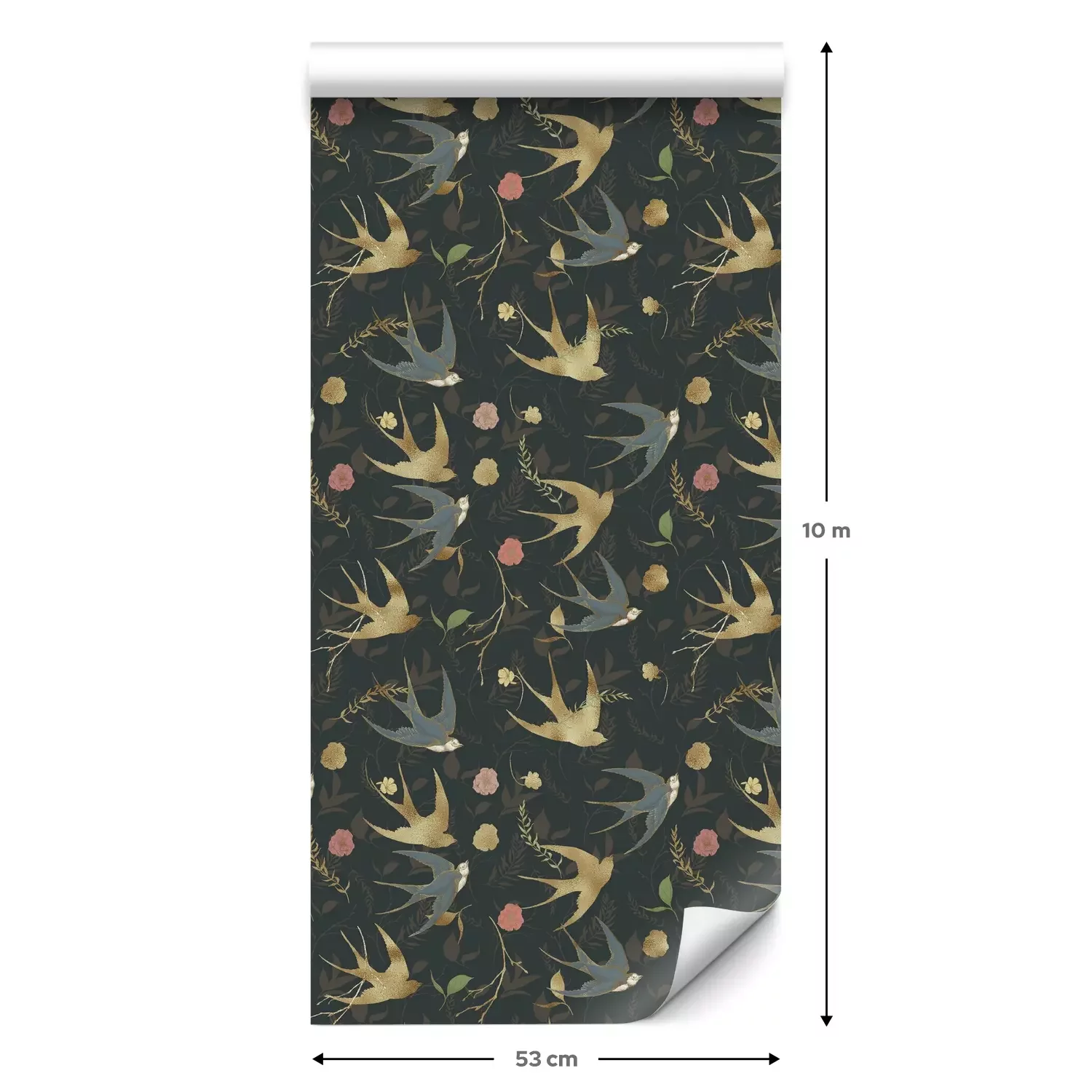 Eine Standard-Tapetenrolle hat die Maße 0,53 m x 10 m und deckt eine Wandfläche von etwa 5 m² ab.