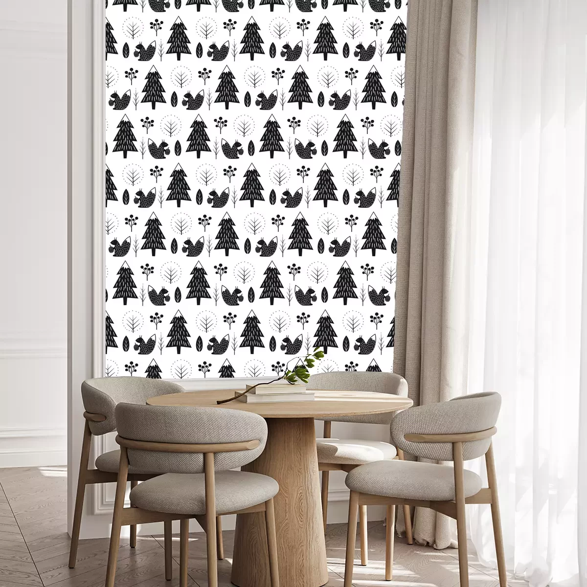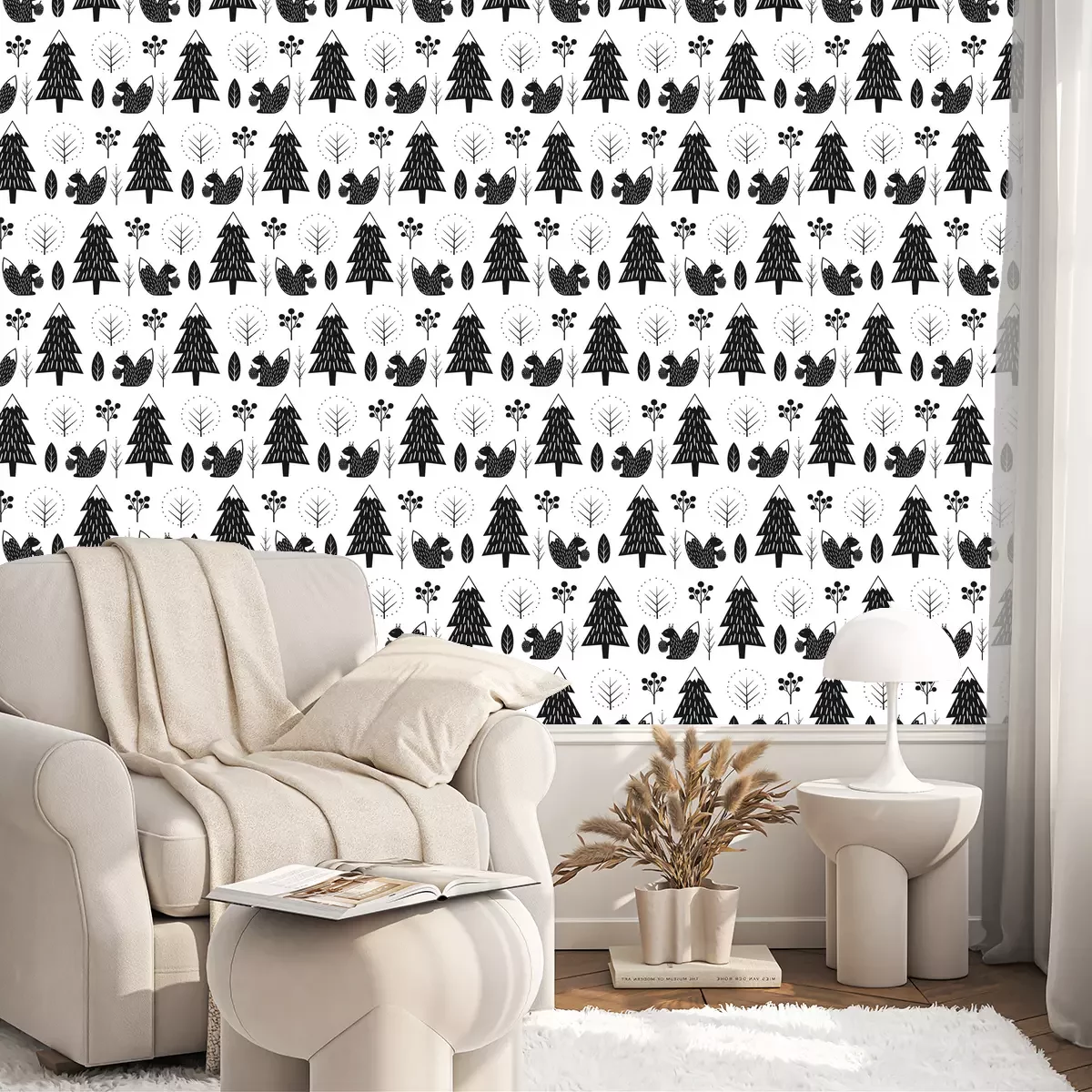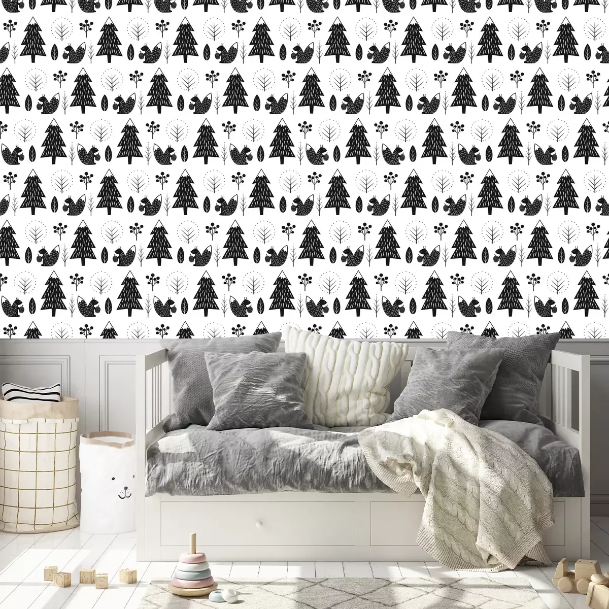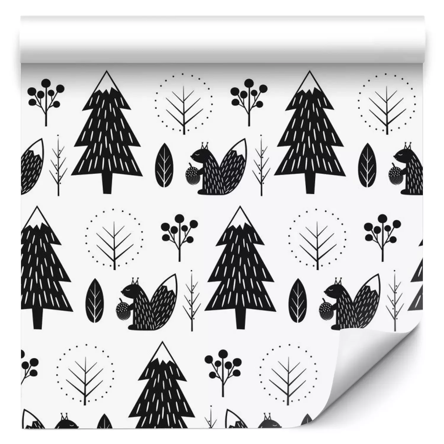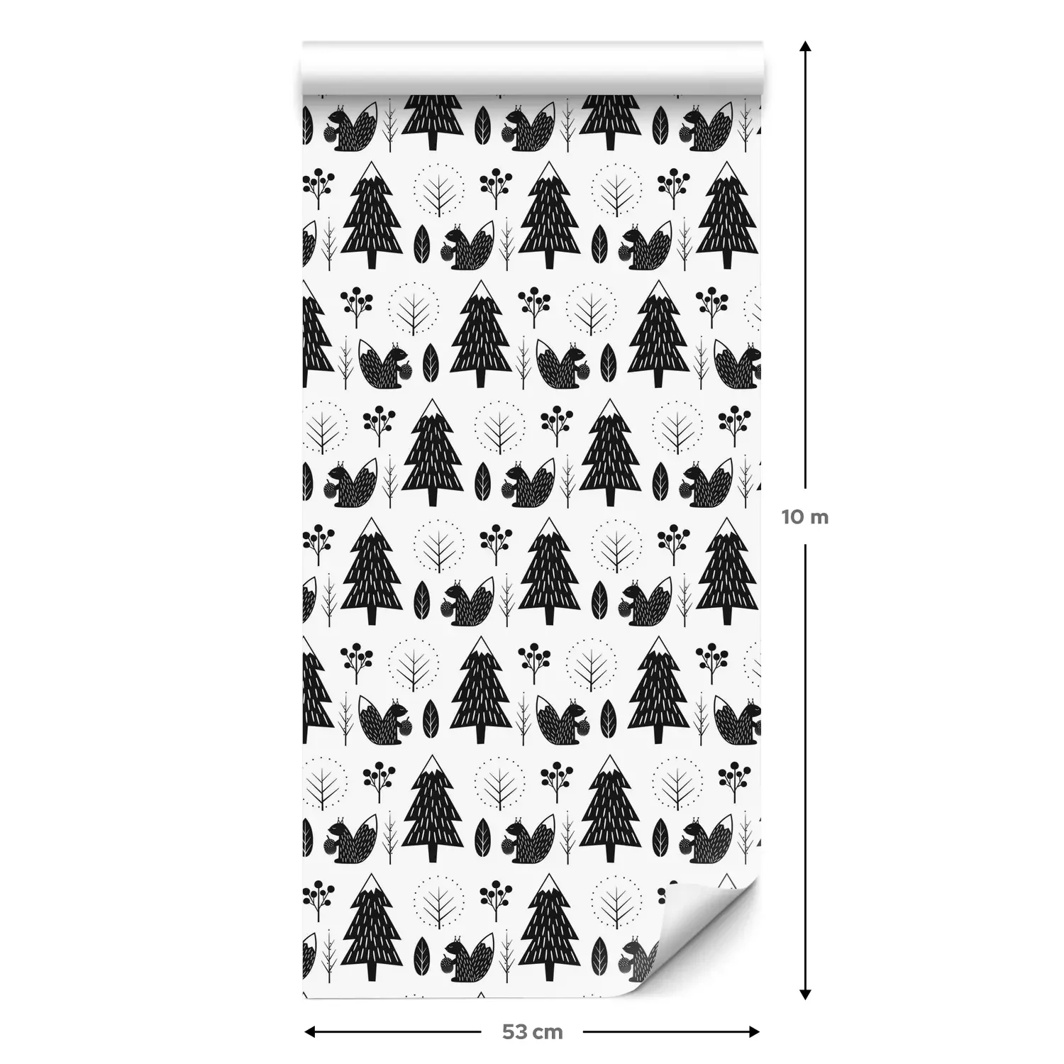 Tapete Schwarz-weißes skandinavisches Muster mit Eichhörnchen im Wald