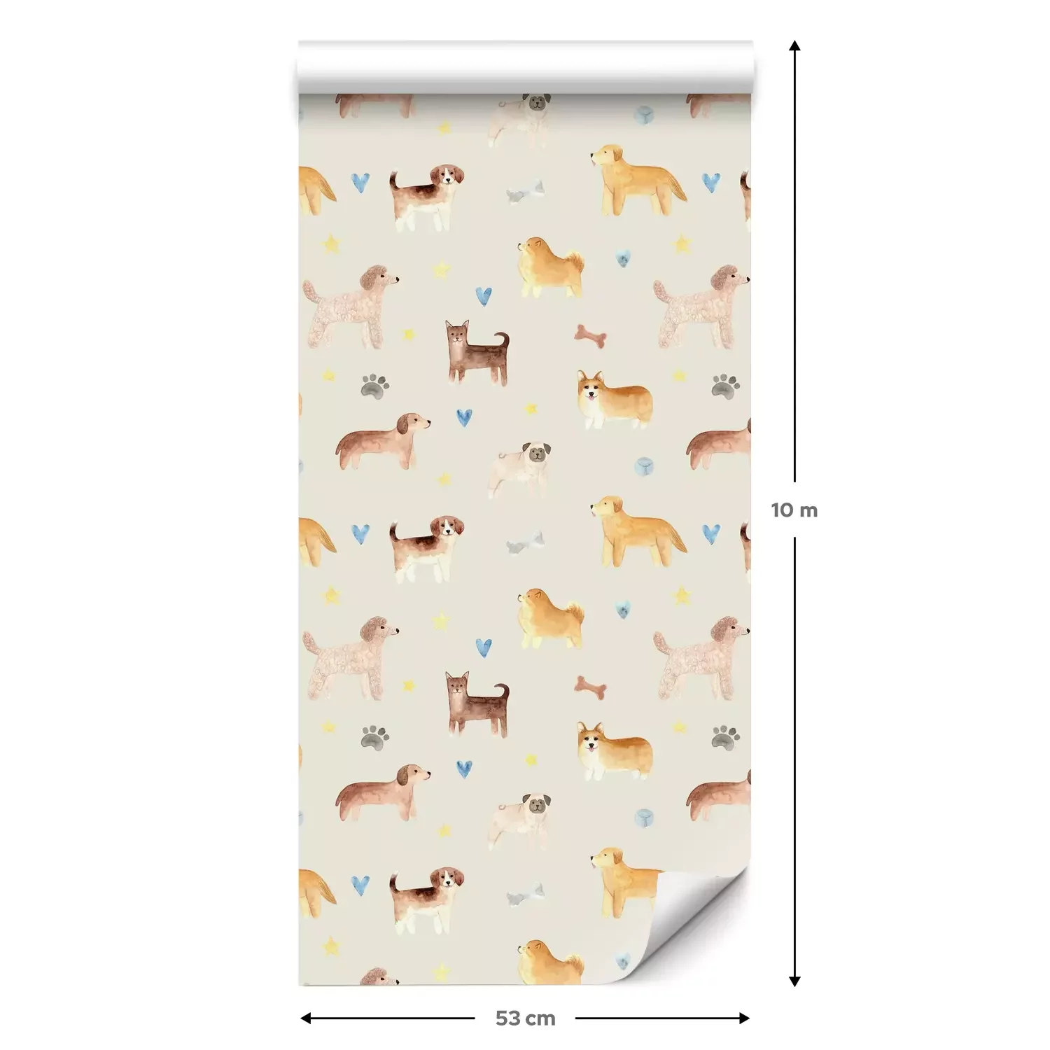 Eine Standard-Tapetenrolle hat die Maße 0,53 m x 10 m und deckt eine Wandfläche von etwa 5 m² ab.
