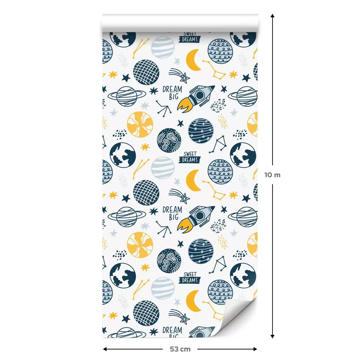 Eine Standard-Tapetenrolle hat die Maße 0,53 m x 10 m und deckt eine Wandfläche von etwa 5 m² ab.