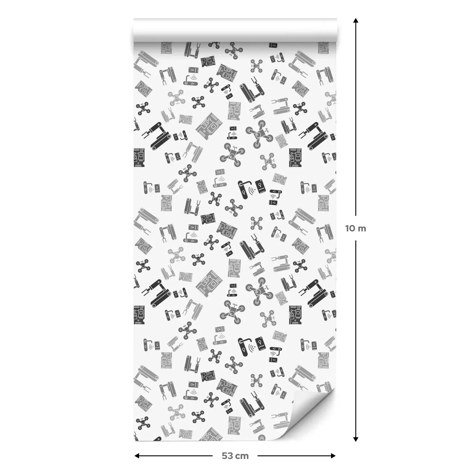 Eine Standard-Tapetenrolle hat die Maße 0,53 m x 10 m und deckt eine Wandfläche von etwa 5 m² ab.