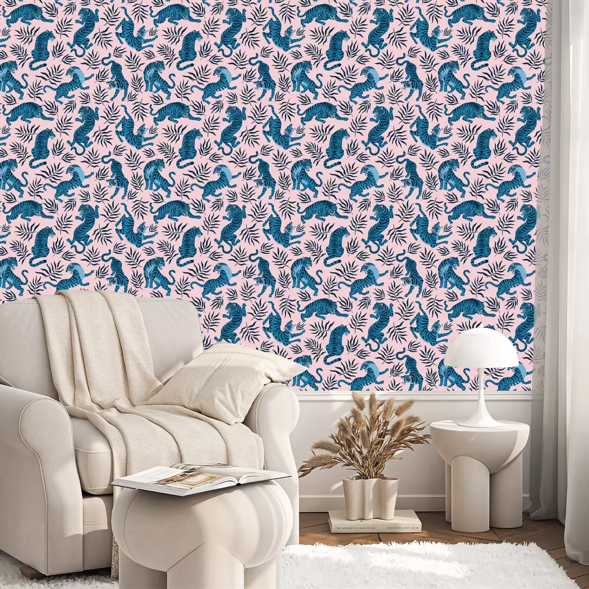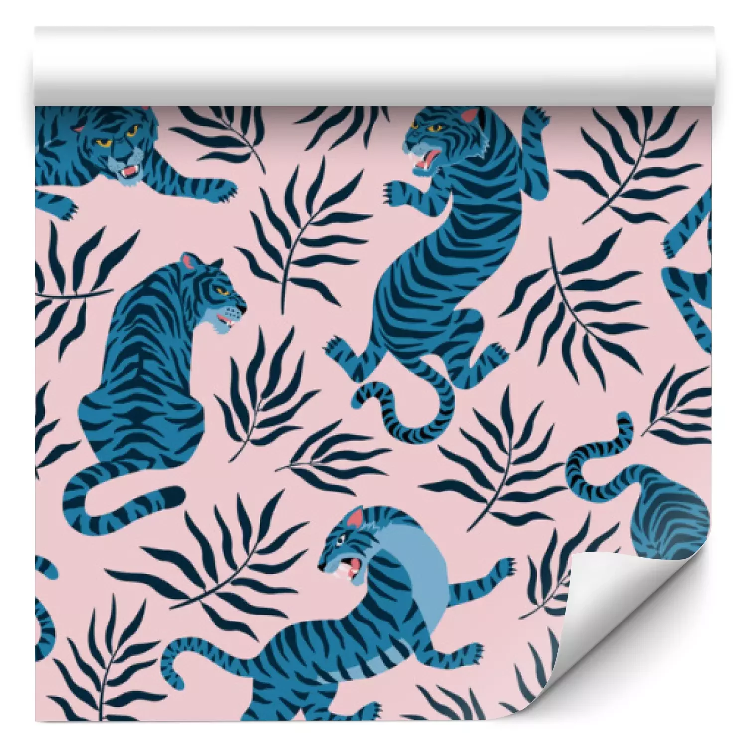 Tapete Tigers and tropical leaves. Trendy illustration. Abstract contemporary seamless pattern.