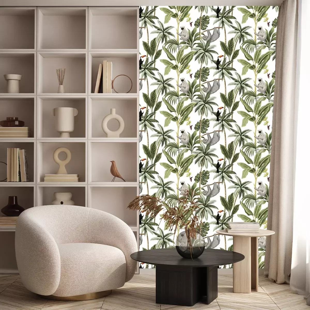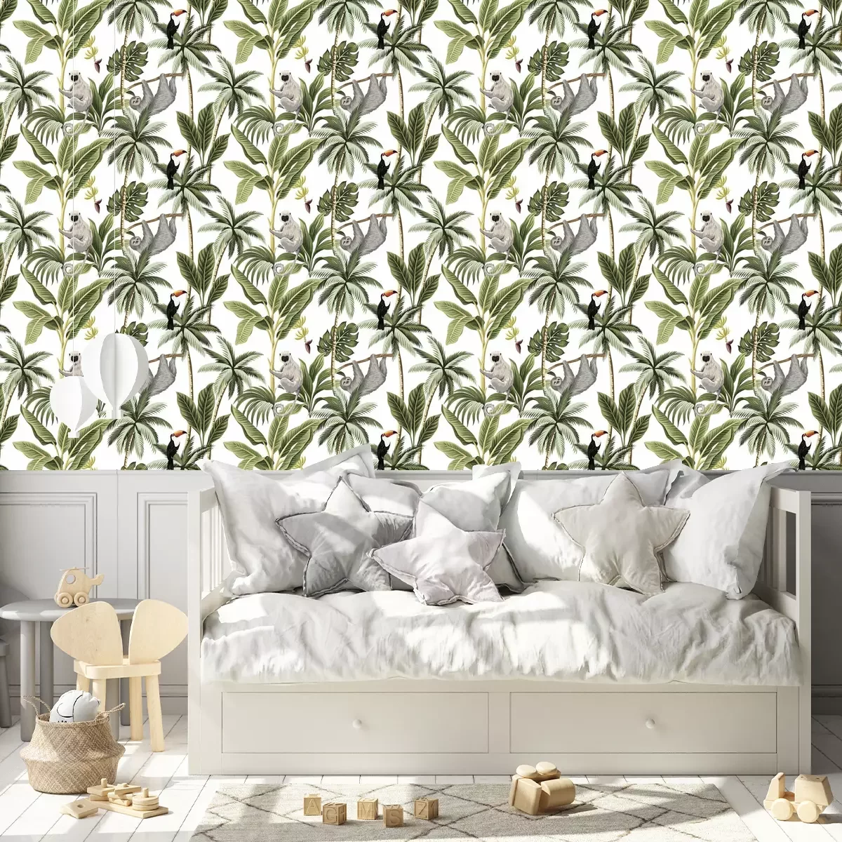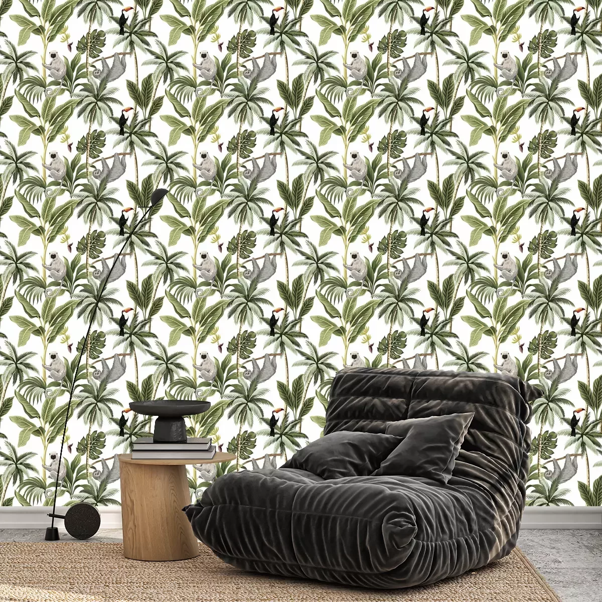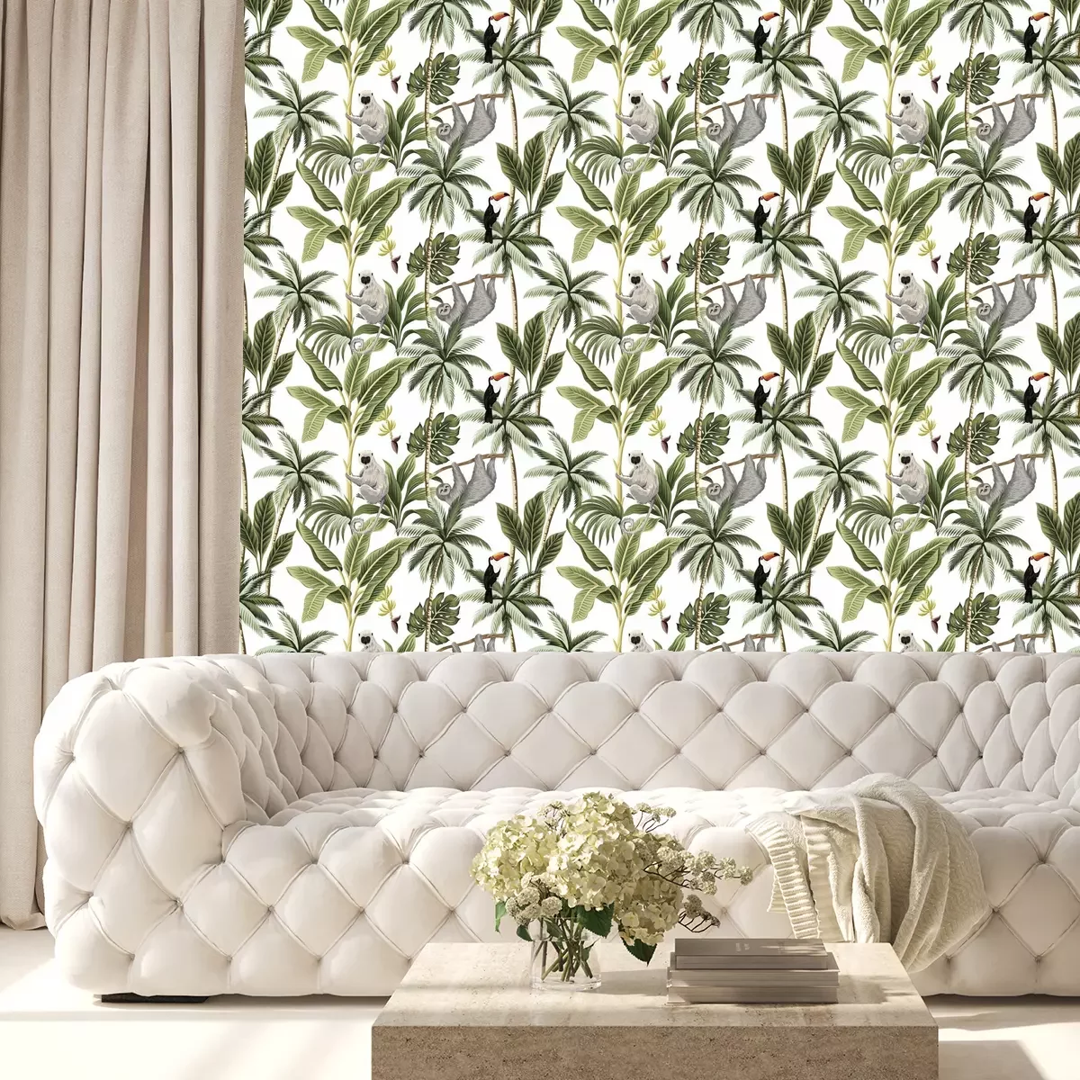 Tapete Tropical vintage animals, toucan, palm trees, banana tree floral seamless pattern white background. Exotic jungle wallpaper.
