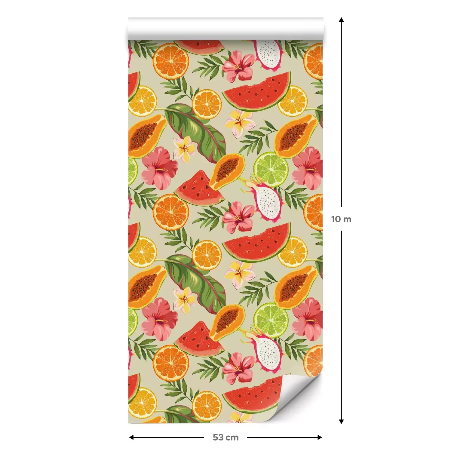 Eine Standard-Tapetenrolle hat die Maße 0,53 m x 10 m und deckt eine Wandfläche von etwa 5 m² ab.