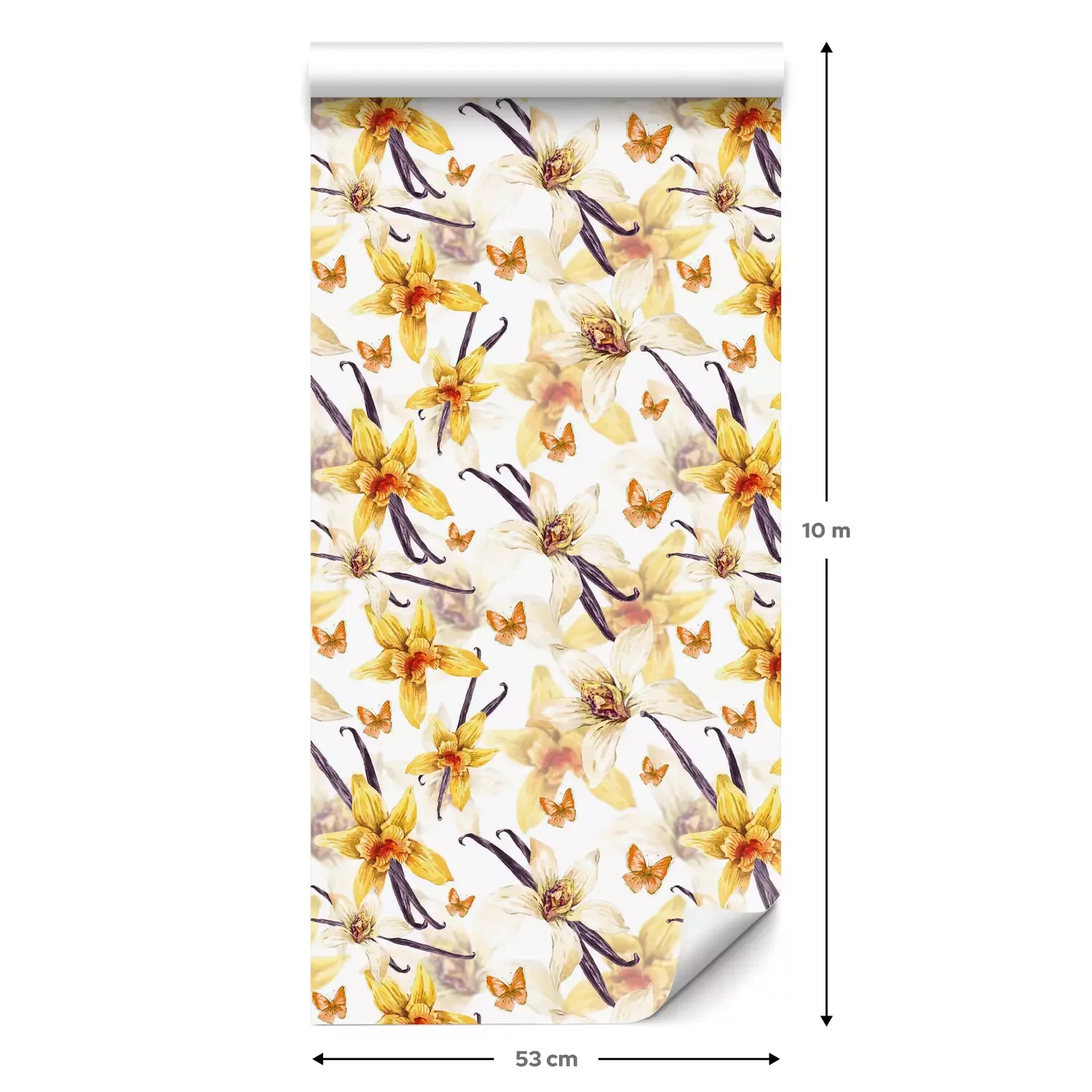Eine Standard-Tapetenrolle hat die Maße 0,53 m x 10 m und deckt eine Wandfläche von etwa 5 m² ab.