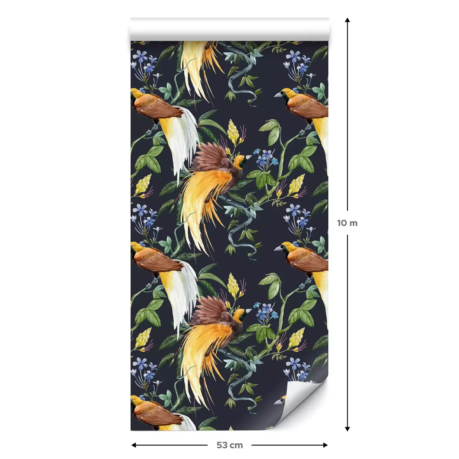 Eine Standard-Tapetenrolle hat die Maße 0,53 m x 10 m und deckt eine Wandfläche von etwa 5 m² ab.