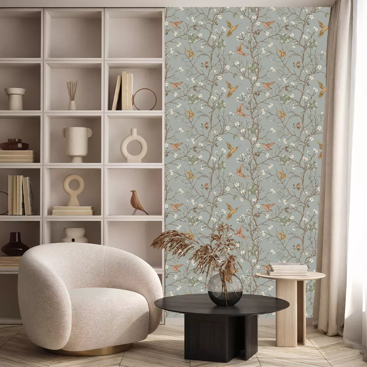 Auf der Produktseite der gewählten Tapete finden Sie oberhalb der Mengenauswahl einen Rechner, mit dem Sie die benötigte Anzahl an Rollen ermitteln können. Geben Sie dazu einfach die Maße der Wand ein, die Sie tapezieren möchten – das Ergebnis wird direkt daneben angezeigt.