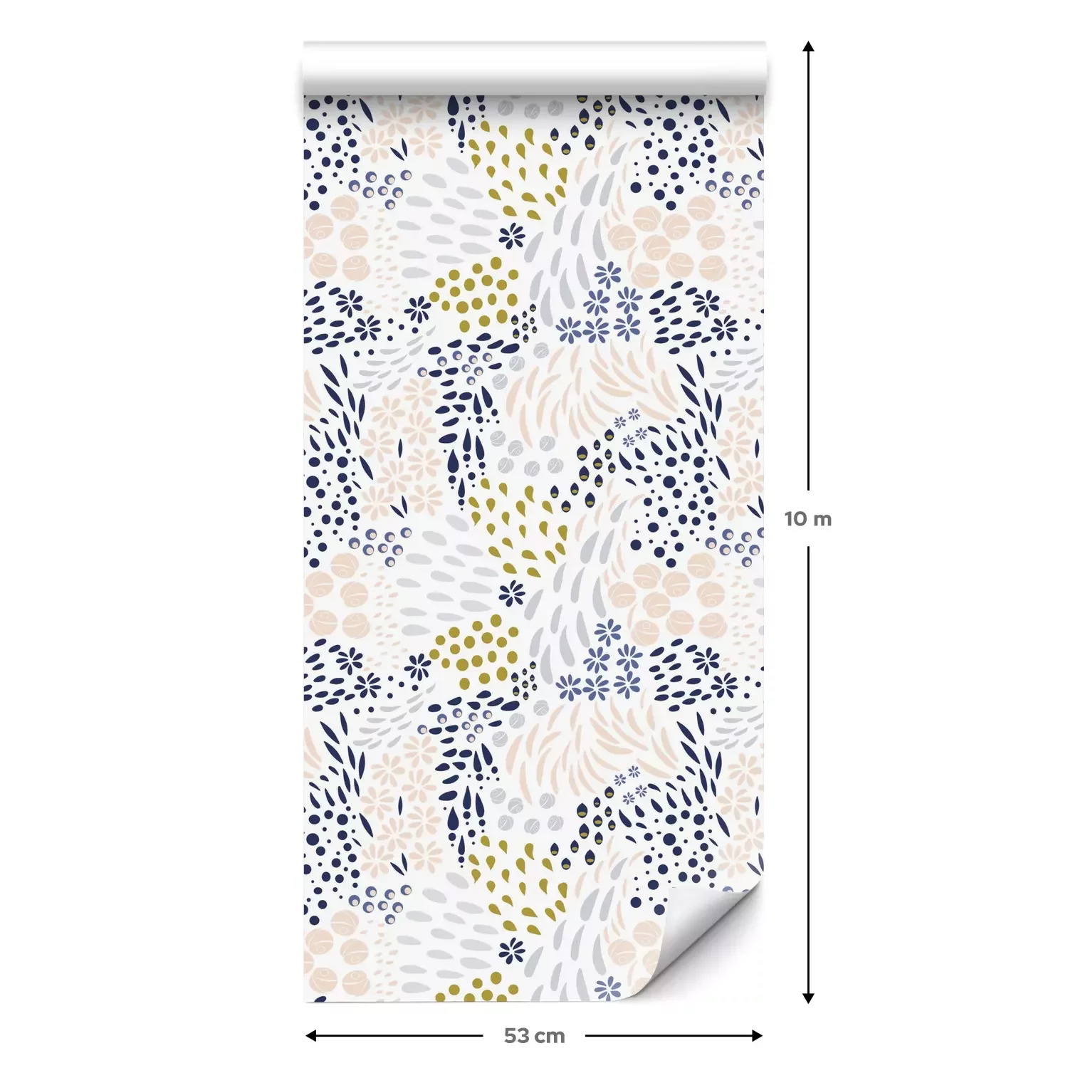 Eine Standard-Tapetenrolle hat die Maße 0,53 m x 10 m und deckt eine Wandfläche von etwa 5 m² ab.